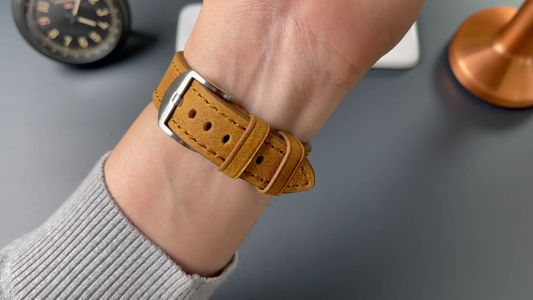 RIOS1931 Echt Juchtenleder Uhrenarmband Tula - Lederunterlage Cognac - goldene Schließe