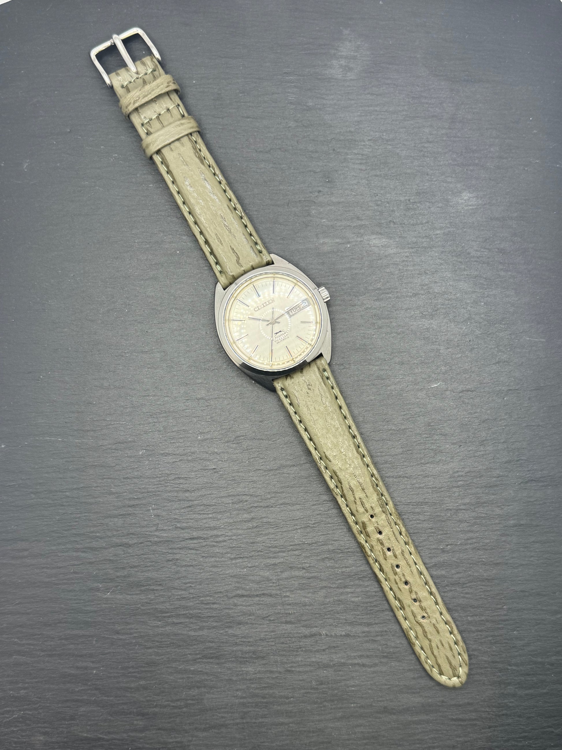 Diese Citizen Leopard Super Beat aus Mai 1970 gehört zu den technisch ambitioniertesten Automatikuhren, die Citizen am Übergang von den 1960er zu den 1970er Jahren gefertigt hat. Die Leopard-Serie markiert den Moment, in dem Citizen den Anspruch erhob, im Segment hochwertiger mechanischer Uhren nicht mehr nur preislich, sondern technisch auf Augenhöhe mit Seiko zu agieren.
