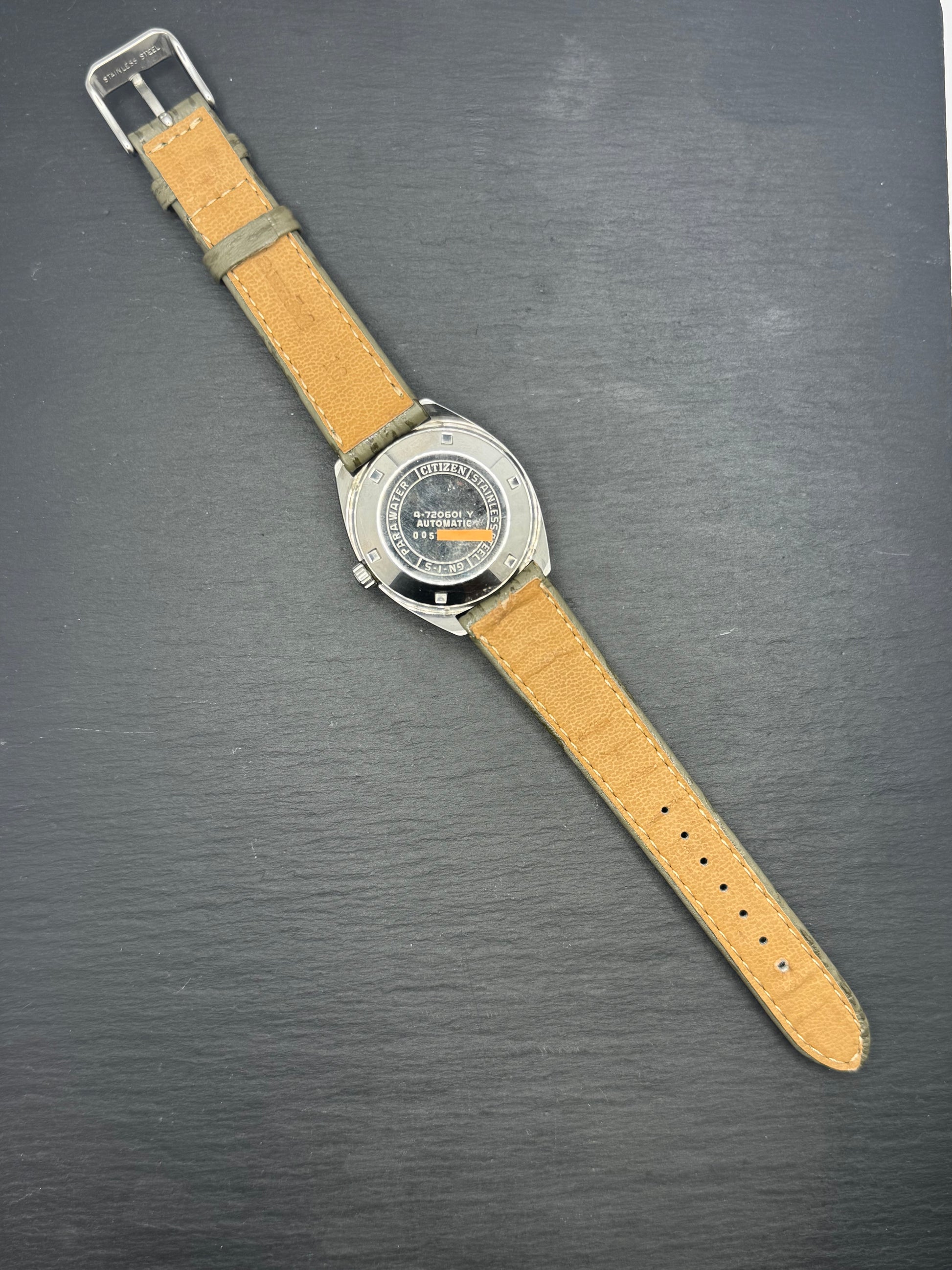 Der verschraubte Edelstahlboden trägt die originale Referenz 4-720601Y sowie die Citizen-Gravuren. Altersbedingte Tragespuren sind vorhanden und unterstreichen den authentischen Vintage-Charakter. Die Uhr wird an einem schönen Lederarmband mit 18 mm Bandanstoß geliefert.