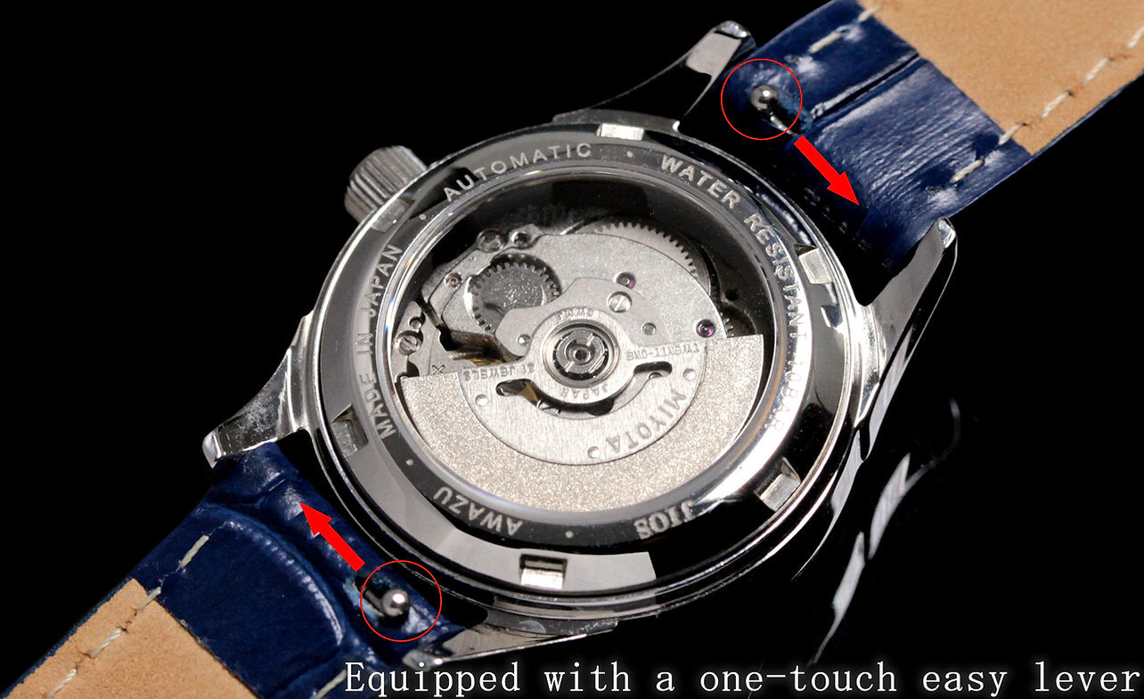 Im Inneren arbeitet das bewährte japanische Automatikwerk Citizen Miyota 6T27, sichtbar durch den Saphirglasboden. Mit einer kompakten Gehäusegröße von 28 mm trägt sich die AWAZU angenehm ausgewogen und ist ideal für schmale Handgelenke oder Liebhaber klassischer Proportionen.