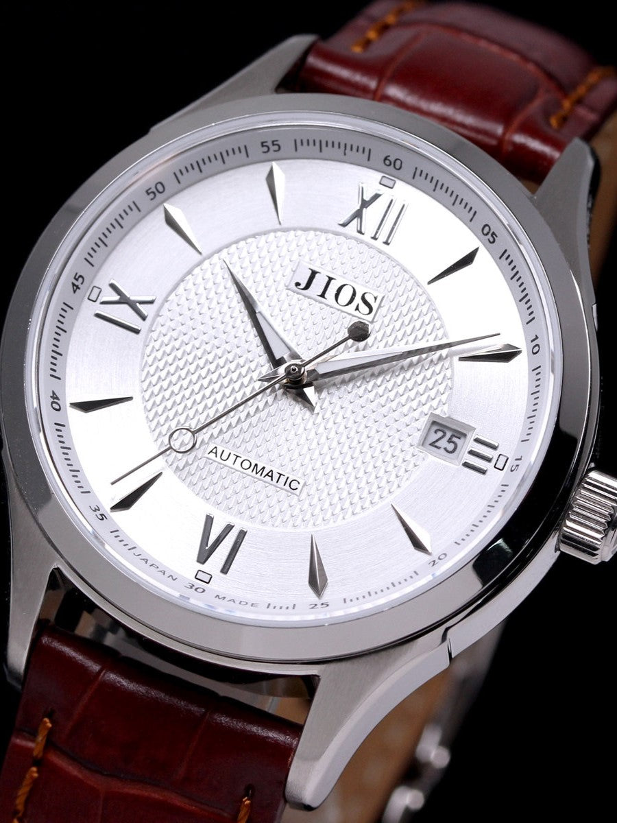 JIOS 's first model, the "SEIRAN," boasts a sophisticated, classic design that looks stylish and elegant on the wrist. The watch combines Roman numerals with bar indices for optimal legibility. A date display enhances its everyday suitability, while the guilloché dial with its fine texture makes it a perfect choice for a variety of situations—from business meetings to dinner.