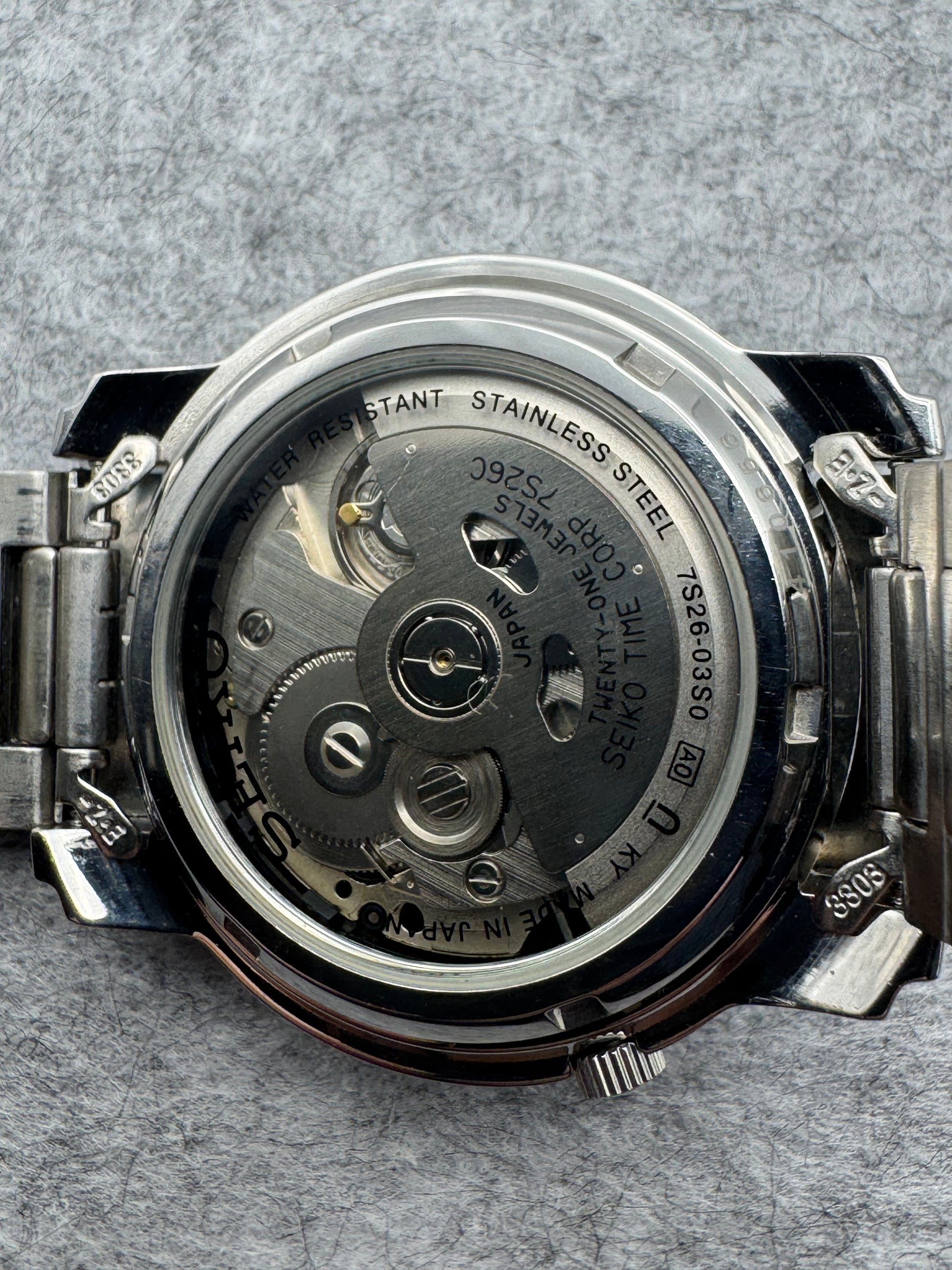 - Bracelet: Original Seiko 5 stainless steel bracelet with "Seiko 5 Japan" folding clasp, slight signs of wear