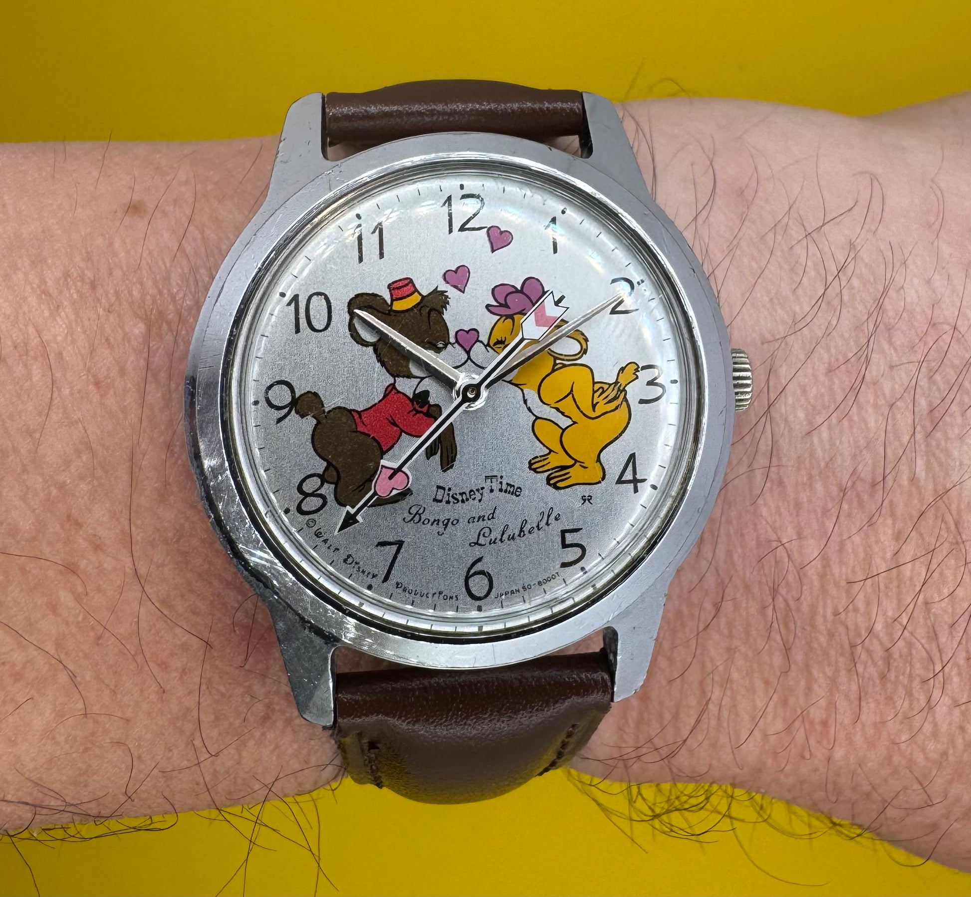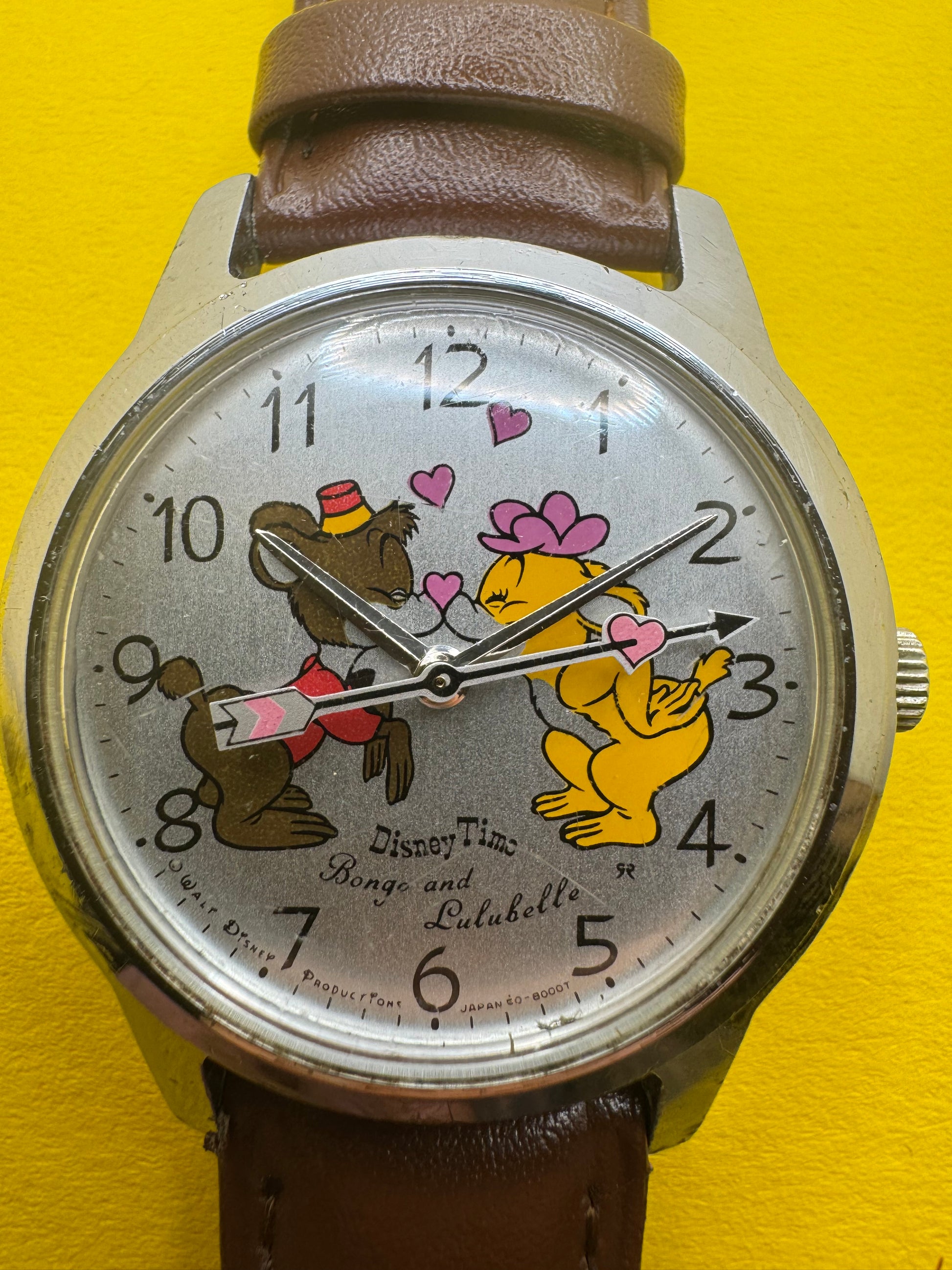 Besonders bemerkenswert ist die außergewöhnlich gute Erhaltung des Zifferblatts: Die Drucke sind klar, die Farben kräftig und nicht ausgewaschen, die Disney-Beschriftungen („Disney Time“, „Bongo and Lulubelle“, Copyright-Hinweise) sind vollständig und sauber erhalten. Gerade bei diesen Modellen ist das Zifferblatt der entscheidende Werttreiber – viele Exemplare zeigen heute starke Abriebe, Verfärbungen oder Nachdrucke. Hier liegt ein authentisches, sammelwürdiges Original vor.
