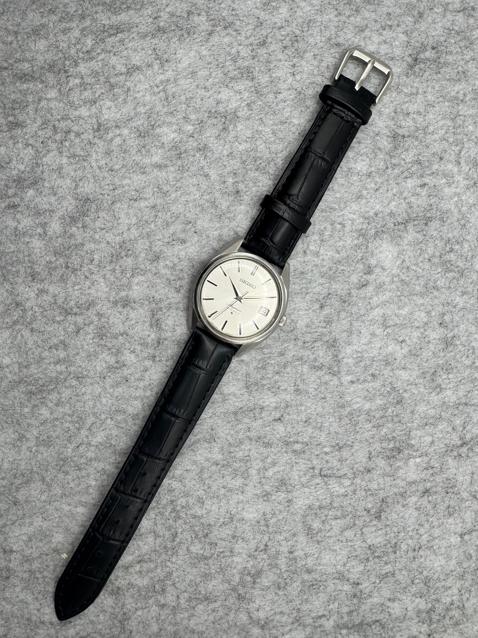 This watch from March 1969 impresses with its classic silver sunburst dial , applied indices, and finely satin-finished and polished stainless steel case with a narrow bezel. The simple three-hand arrangement and the finely proportioned date window at 3 o'clock lend the watch a balanced, typically Japanese understatement.