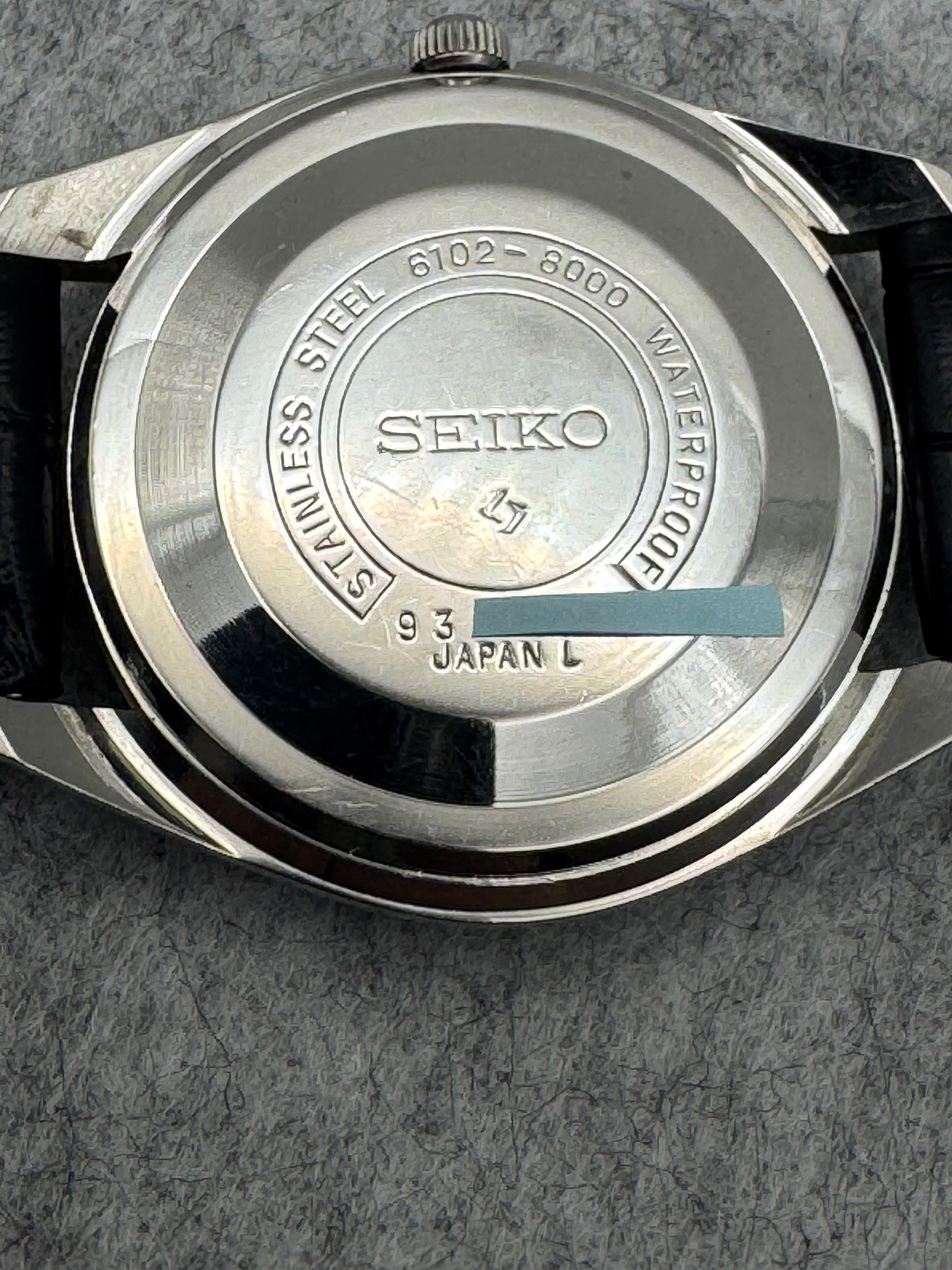 - Caliber: Seiko 6102A (hand-wound, 21 jewels, 18,000 A/h)