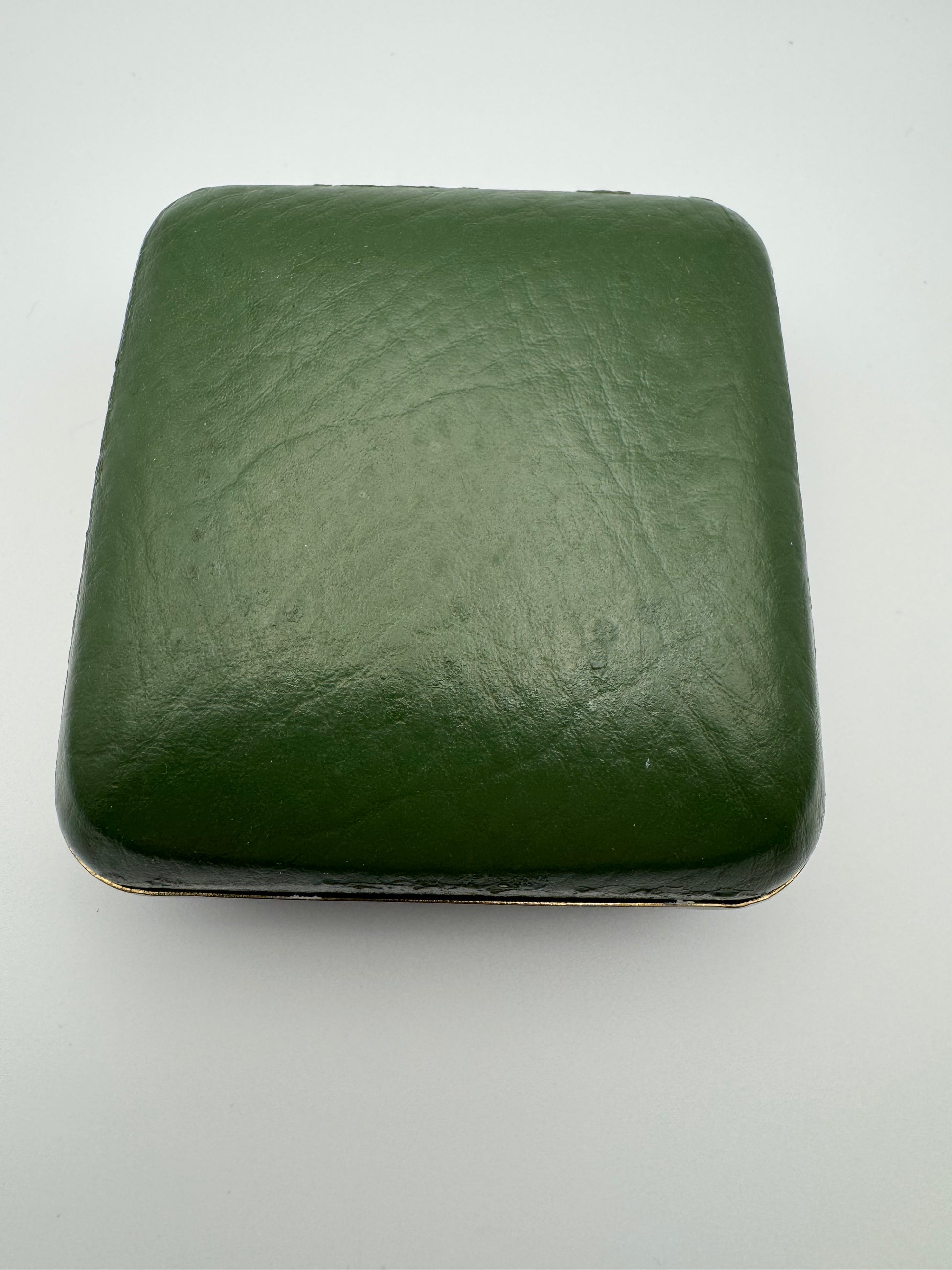 It comes in a green faux leather case with a brass frame , making it ideal for travel or collectors.