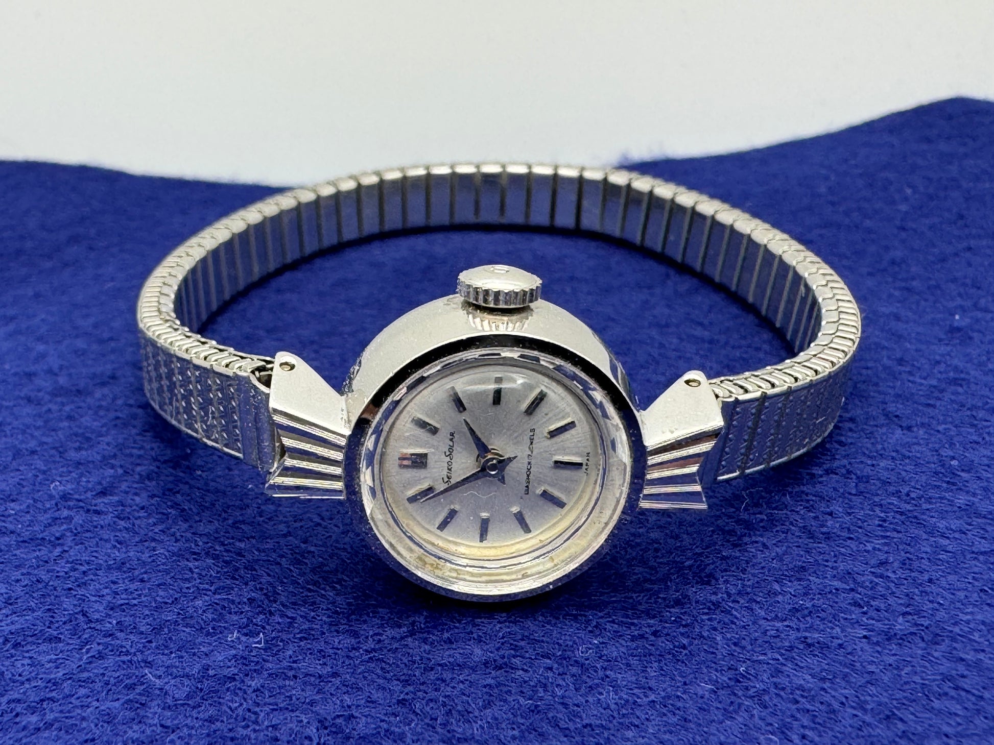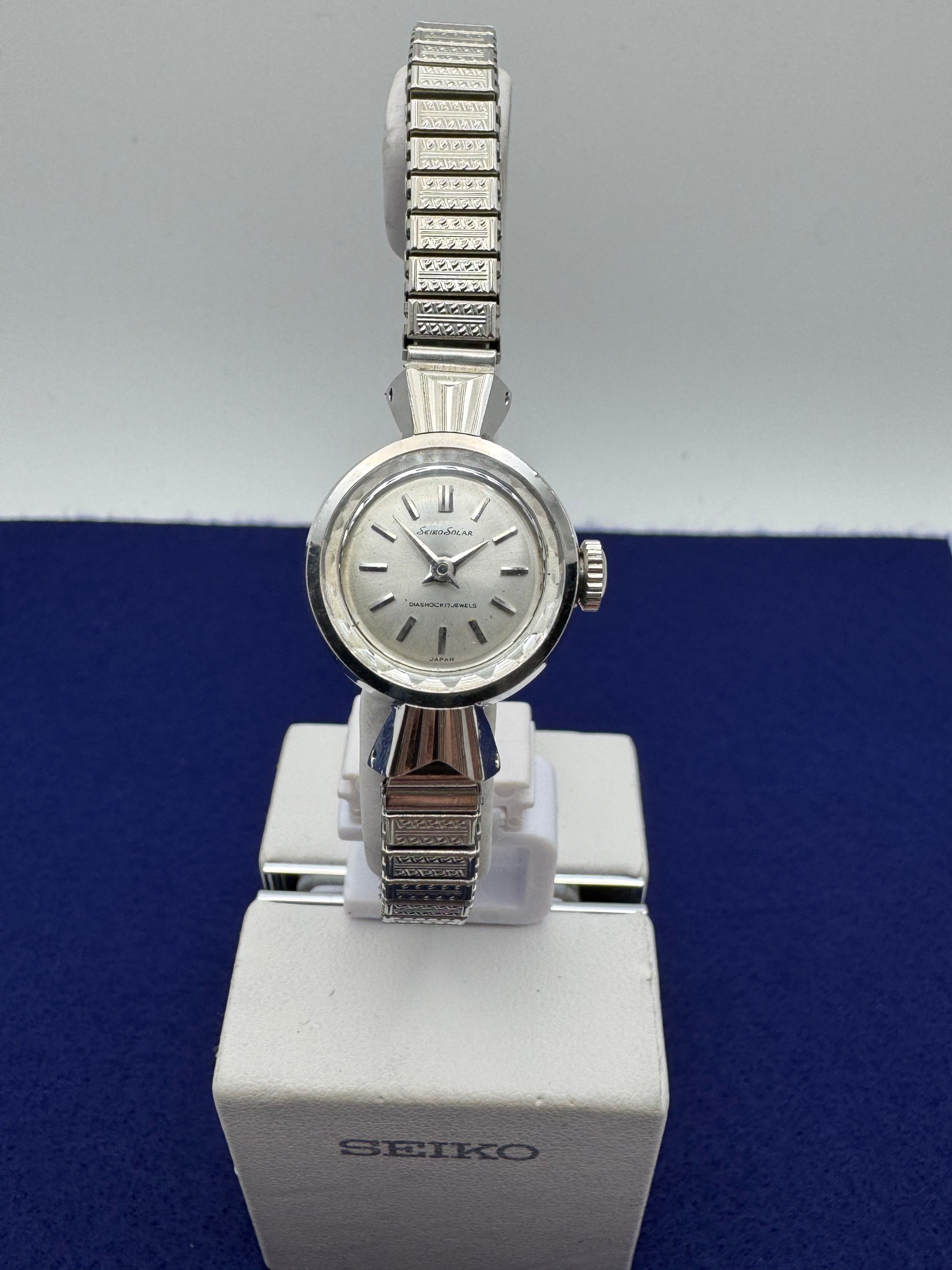 A very elegant Seiko Solar from the mid-1960s with a delicate silver-colored dial and characteristic Bambi flex bracelet from Japan. This watch represents Seiko's early phase of high-quality ladies' models with the then newly developed Diashock 17-jewel hand-wound movement .