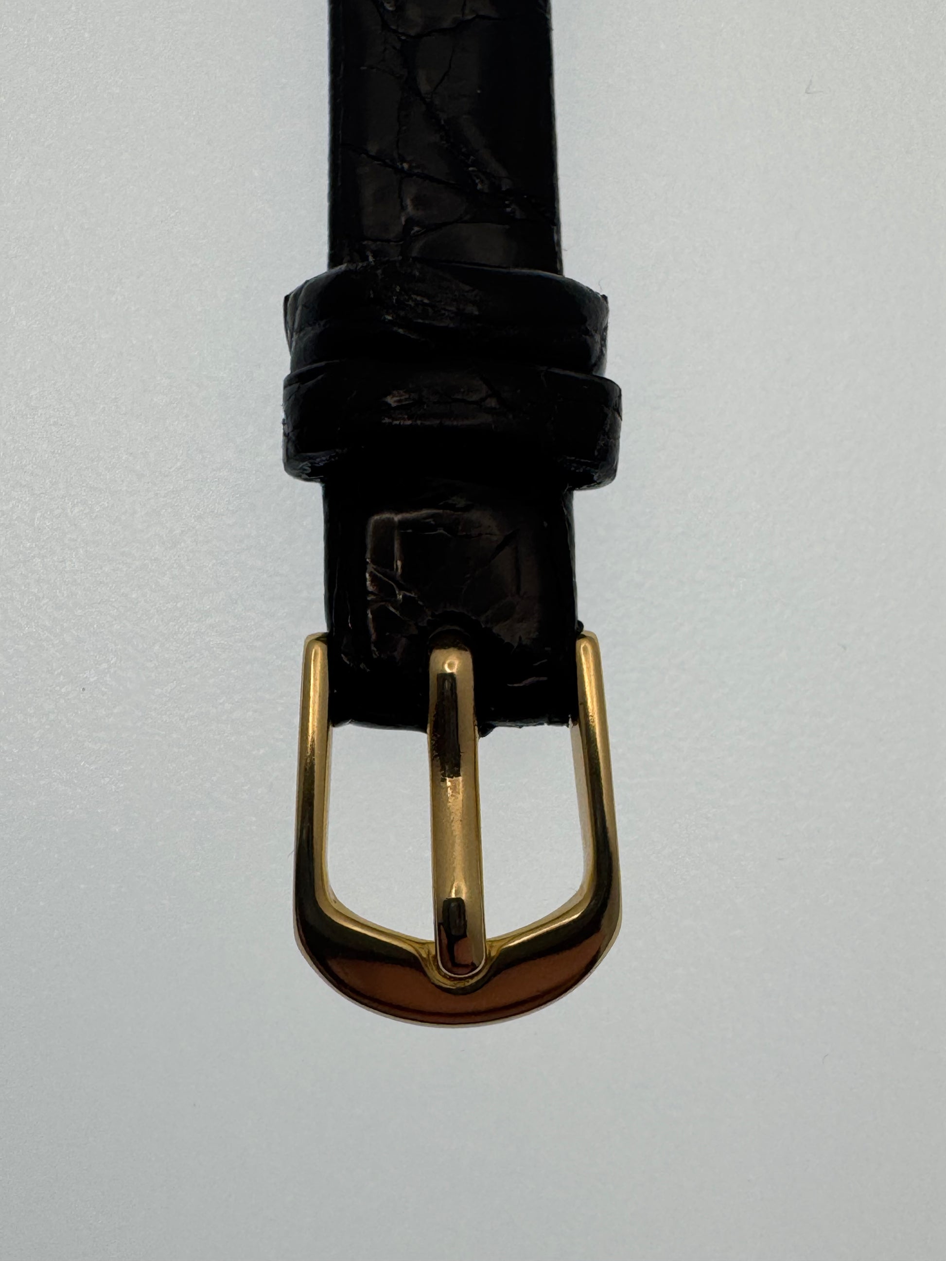 - Strap: New crocodile leather strap (13 mm, black, crocodile side), gold-colored pin buckle