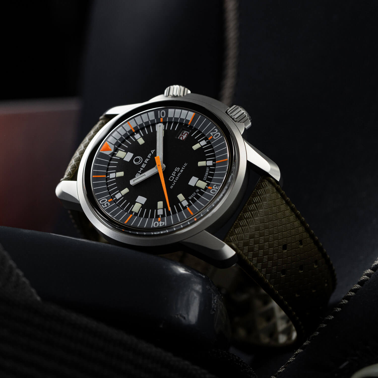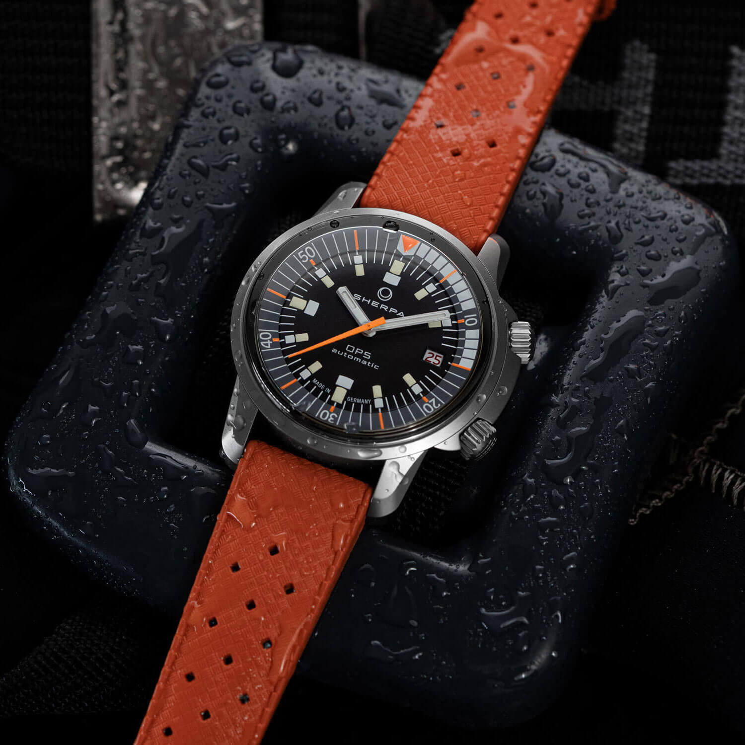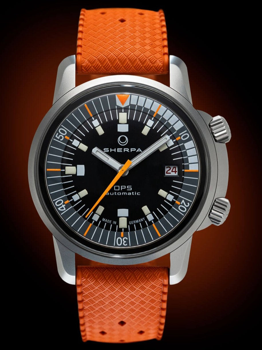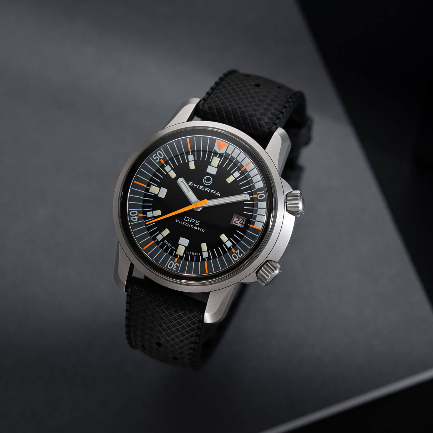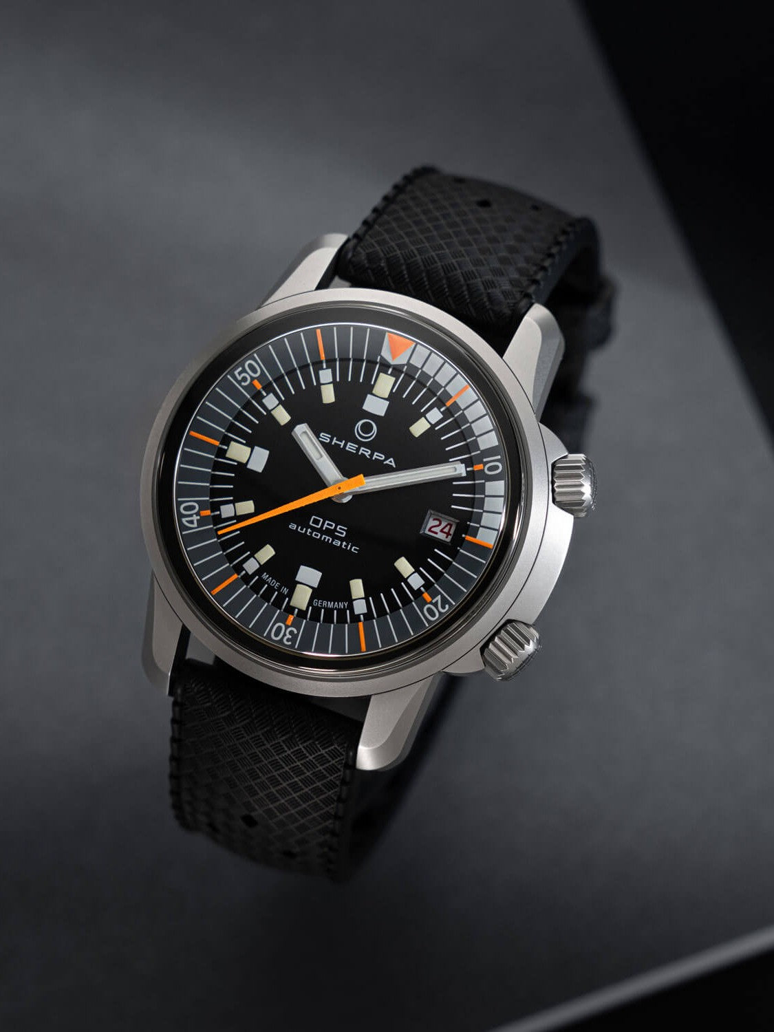 In collaboration with TRTS (The Real Time Show) , a weekly insider podcast about watches, Sherpa is also releasing a new version of its OPS model . It features a simple, satin-finished stainless steel case , which lends the watch a remarkably balanced character: In some light, it appears as the robust tool it clearly is, thanks to its technology and build quality; in other light, it displays a refined, almost ethereal quality, created by the subtle interplay of light on the satin-finished metal surfaces and the sapphire crystal. This new satin finish noticeably alters the style of the watch, offering something truly new visually, while the other specifications remain unchanged. The TRTS collaboration is deliberately understated and commemorated as a fine engraving on the case back – on the breastplate of the diver's helmet.