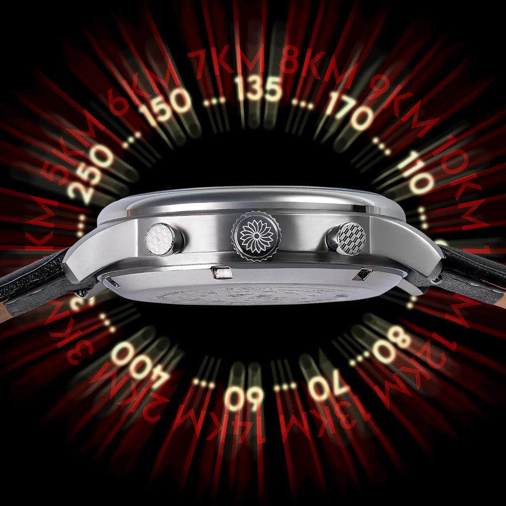 The Tenji is more than just beautiful: its tachymeter and telemeter scales allow you to determine speed and distances – classically inspired, with a modern twist. The dial remains pleasantly uncluttered and exceptionally easy to read.