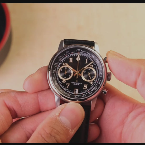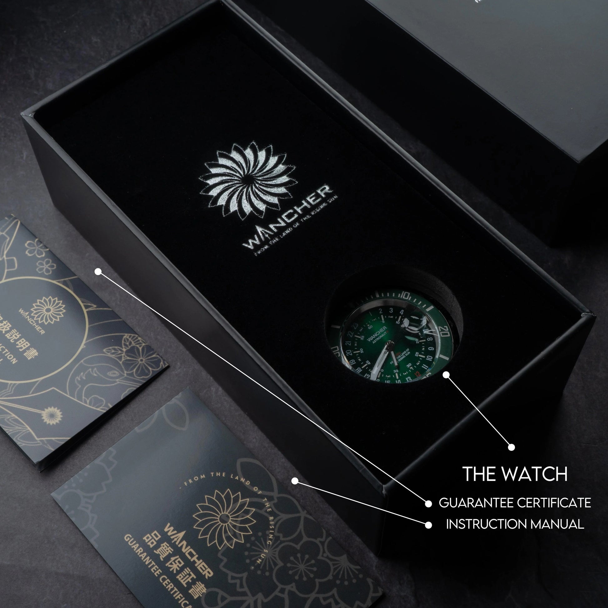 The WANCHER Tenji Chronograph – 38 mm combines clean lines, functional design, and Japanese attention to detail into a compact chronograph that is equally convincing in everyday life and on weekends. Polished stainless steel, double anti-reflective sapphire crystal, and the popular Seiko VK64 Mecaquartz movement ensure a blend of elegance, reliability, and a true chronograph feel.