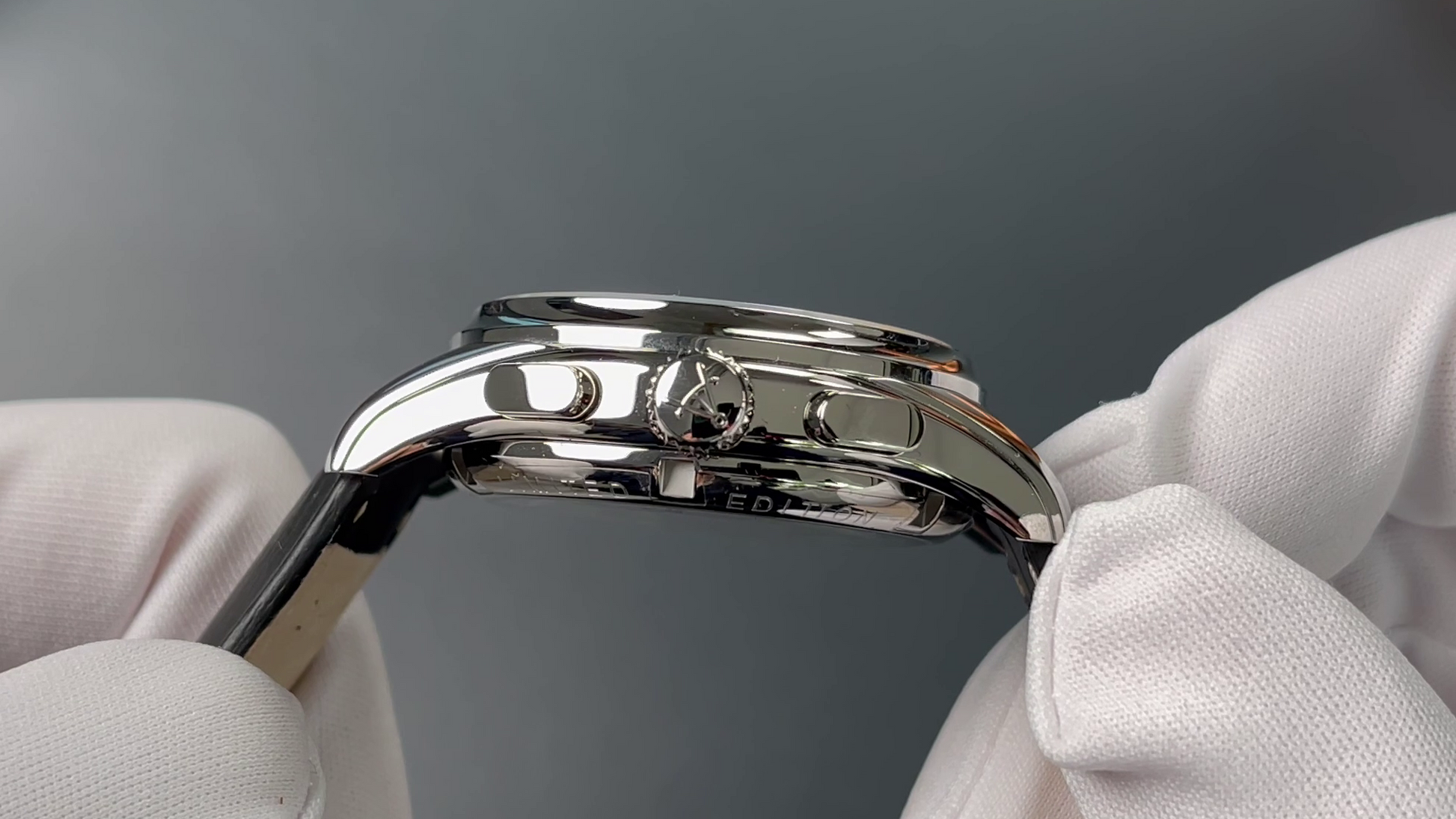 Im Herzen der Uhr schlägt das geschätzte ETA Valjoux 7751 Automatikwerk, ein Meisterwerk der Schweizer Ingenieurskunst, das für seine außergewöhnliche Genauigkeit und Zuverlässigkeit bekannt ist. Die Mondphasenanzeige und der Mondzyklus sind eine atemberaubende Präzision.