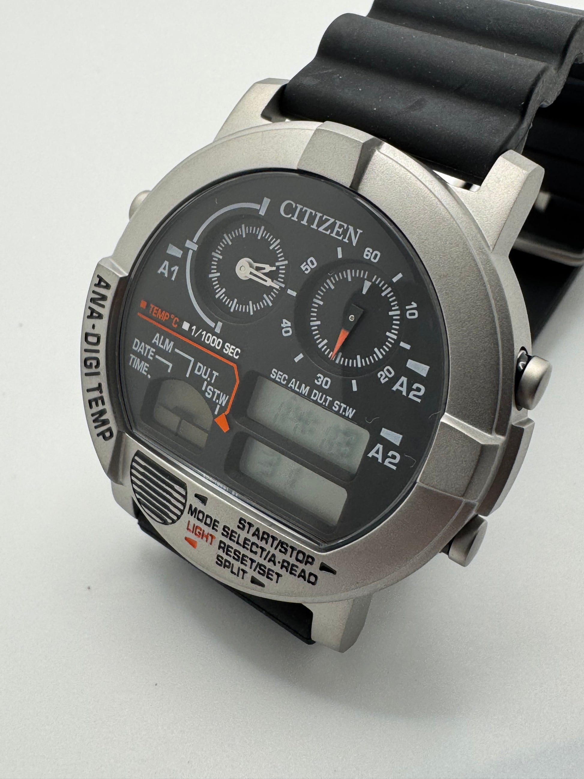 Die Uhr kombiniert analoge und digitale Anzeigen in einem futuristischen, funktionalen Design – ein Konzept, das Citizen bereits in den frühen 1980er Jahren prägte. Mit Funktionen wie Temperaturanzeige, Alarm, Chronograph, Dual Time und Beleuchtung war sie ihrer Zeit weit voraus.