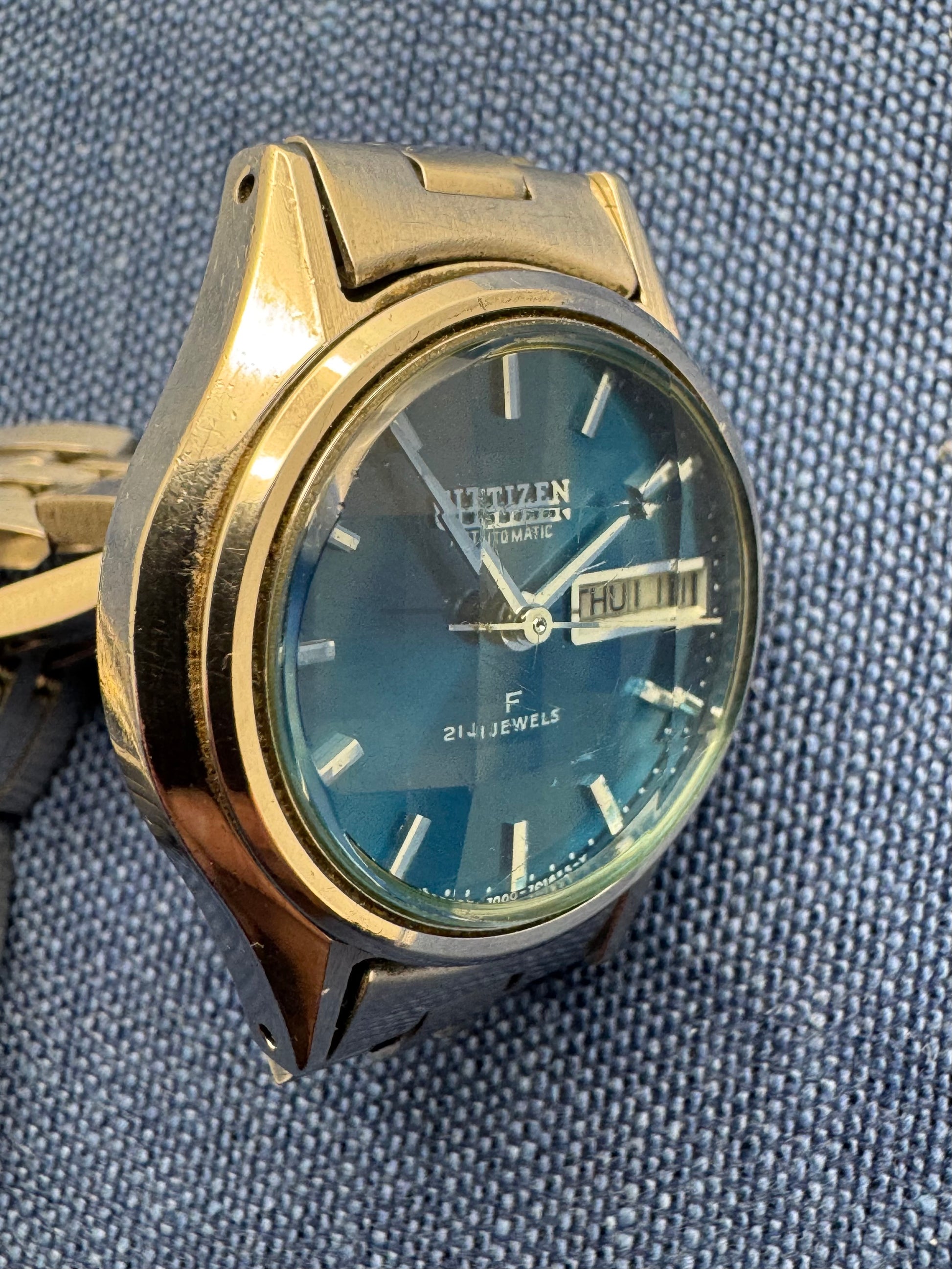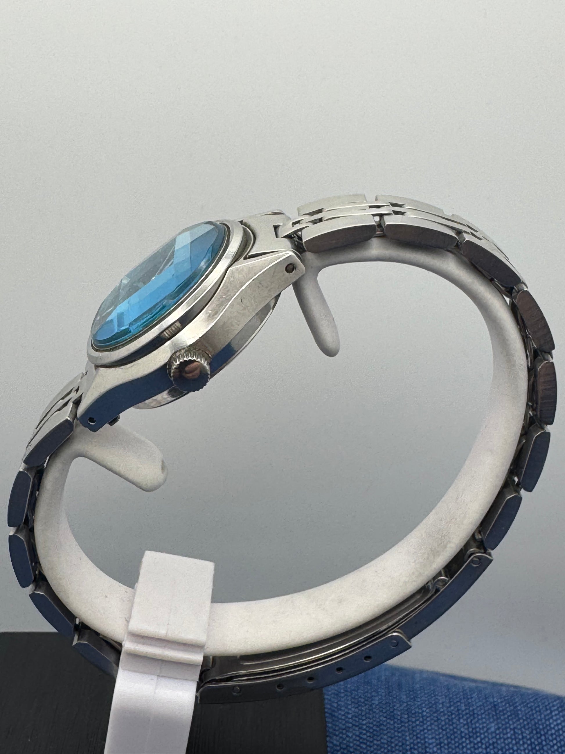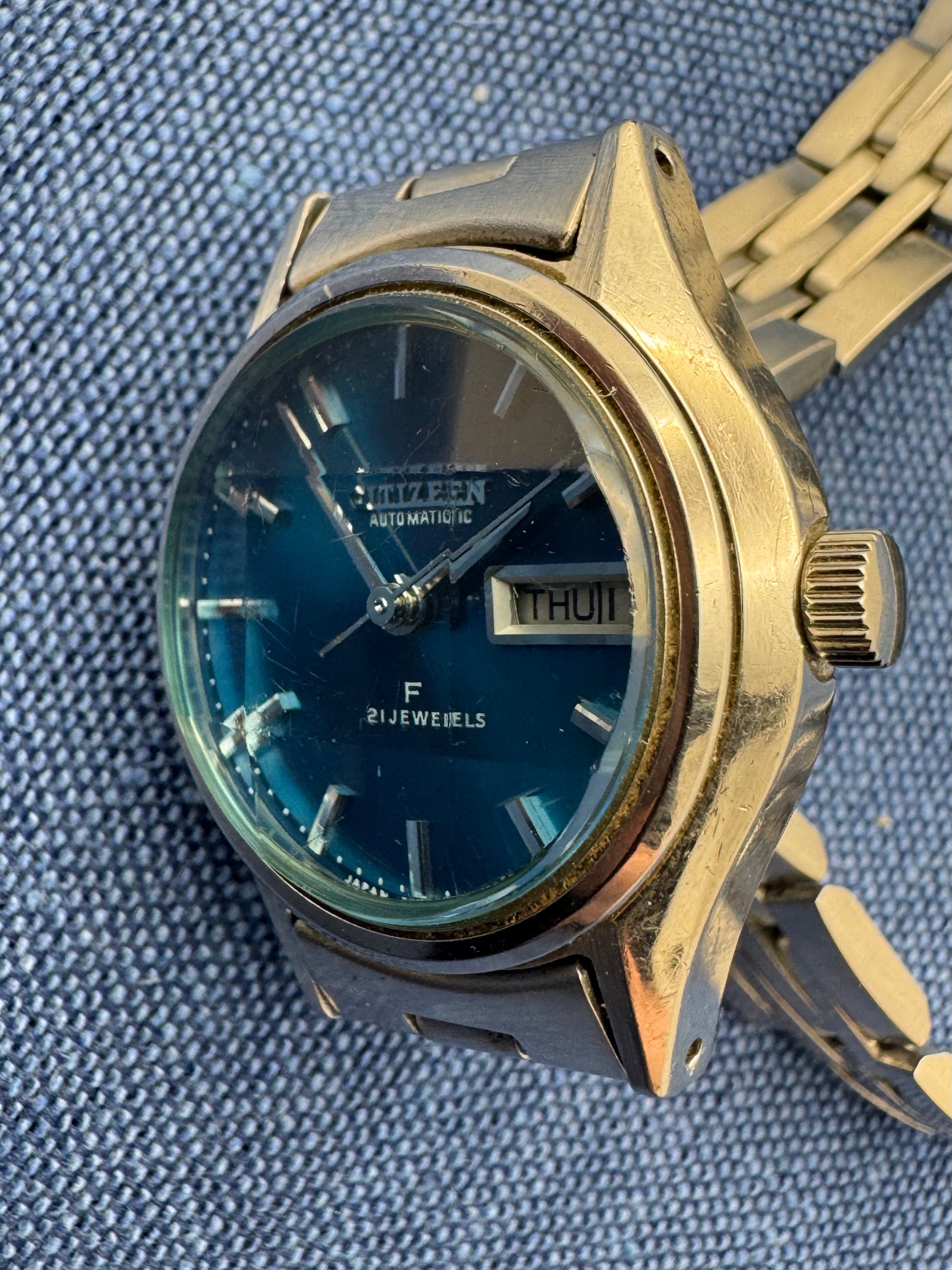 Diese elegante Citizen-Damenautomatik stammt aus Juli 1975, eindeutig datierbar über die Seriennummer 50705151 (5 = 1975, 07 = Juli). Die Uhr gehört zu einer Generation kompakter Automatikmodelle, die Citizen Mitte der 1970er Jahre speziell für den japanischen Markt entwickelte. Charakteristisch für diese Zeit sind kräftige Farbverläufe auf dem Zifferblatt, facettierte Mineralgläser und technisch zuverlässige, kleine Automatikwerke mit hohen Gangreserven und guter Alltagstauglichkeit.