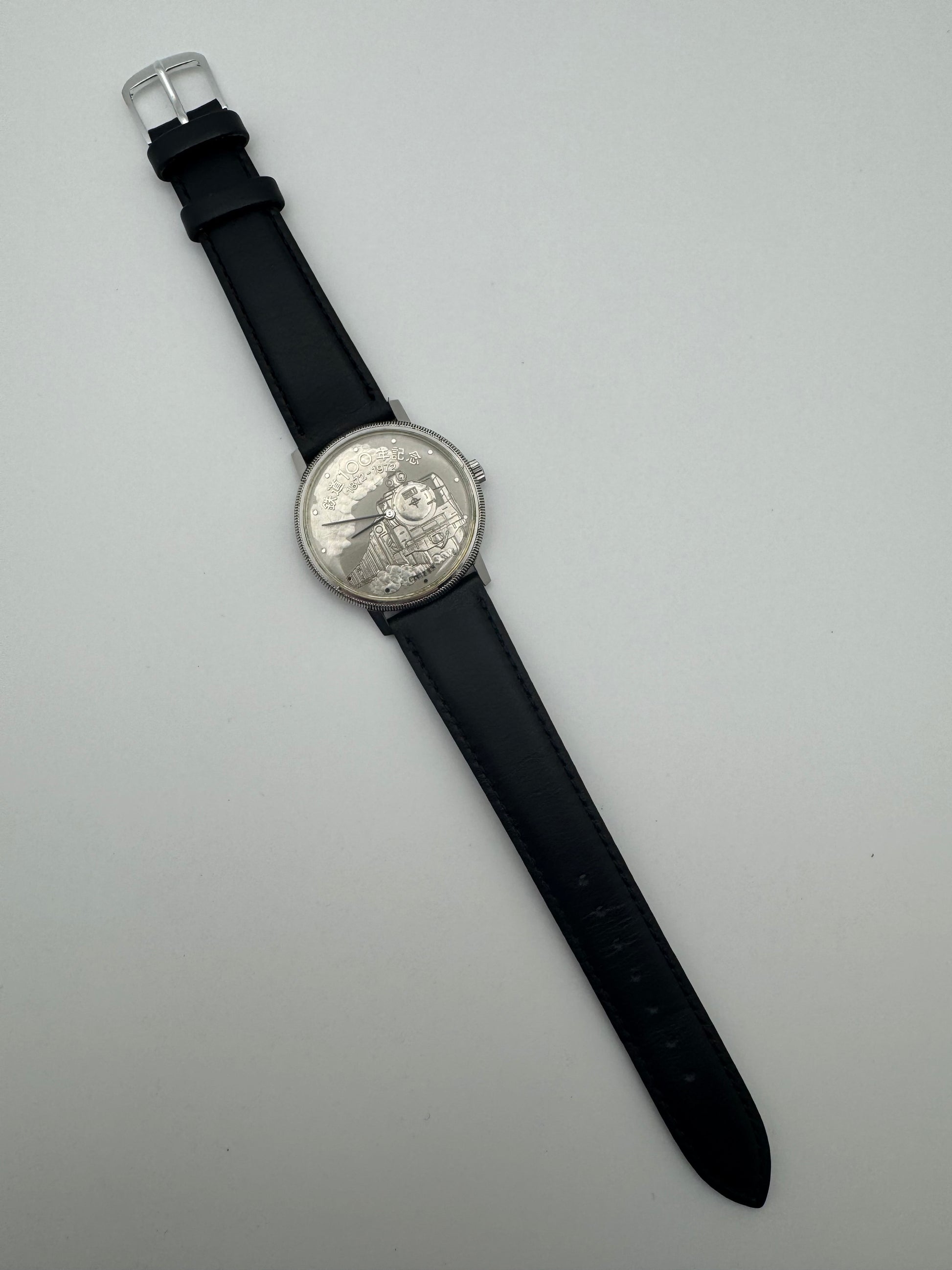 Das Zifferblatt ist eine kunstvoll geprägte Metallrelief-Darstellung einer Dampflokomotive, die auf die erste in Japan eingesetzte Lokomotive „150 form class“ verweist. Die Gravur trägt die Inschrift: