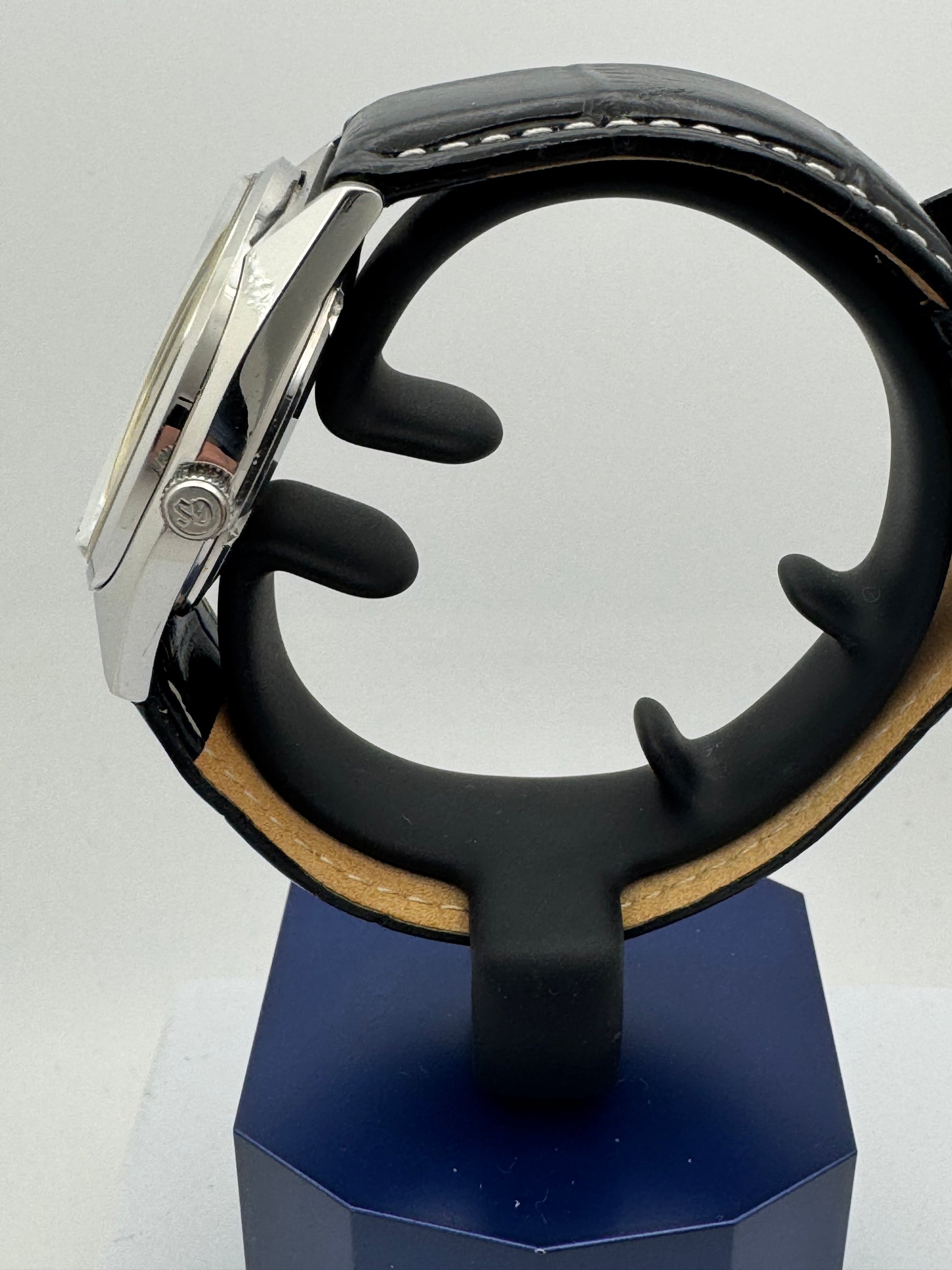 - Gehäuse: Edelstahl, verschraubter Boden mit goldener Grand-Seiko-Plakette