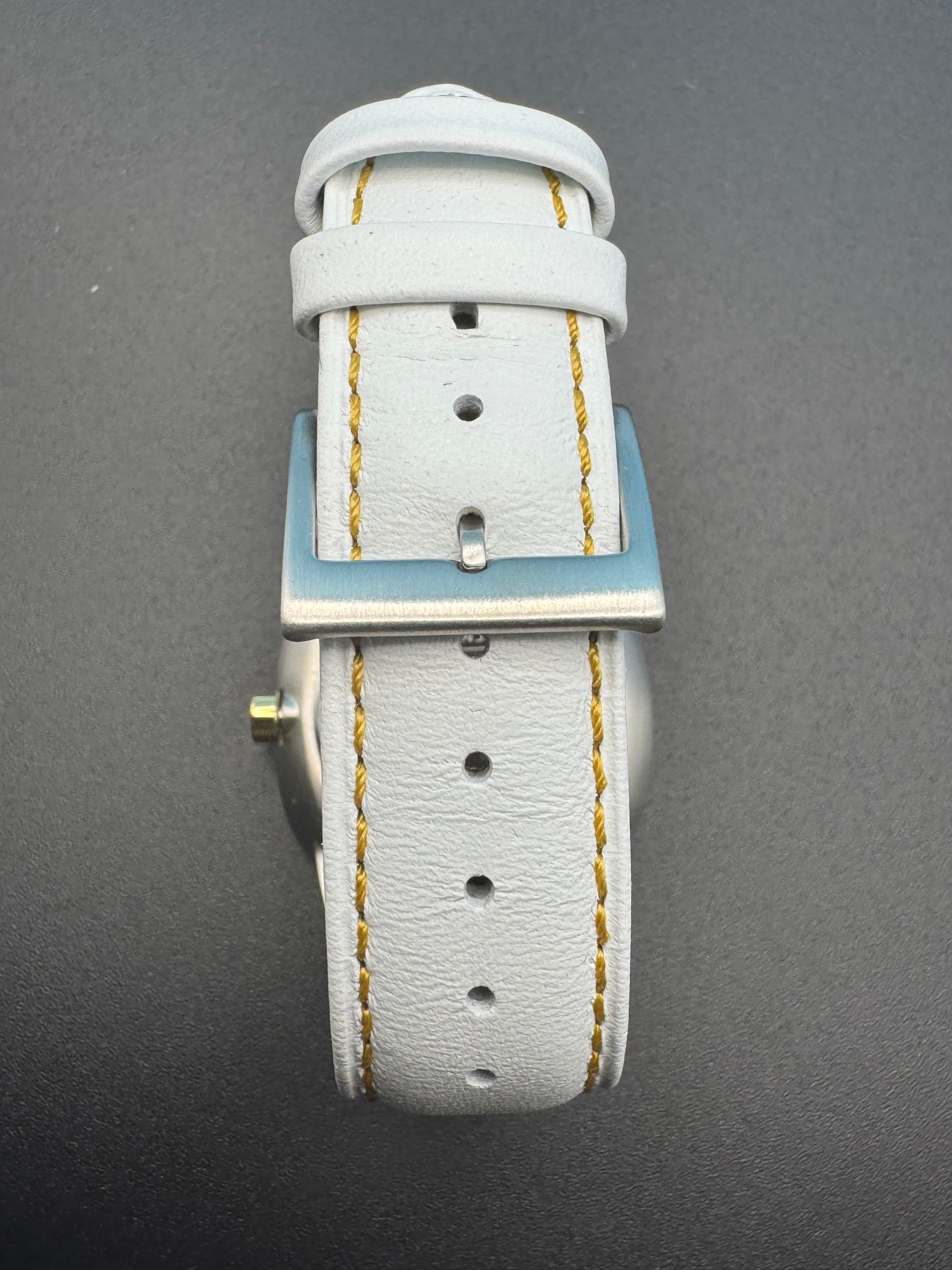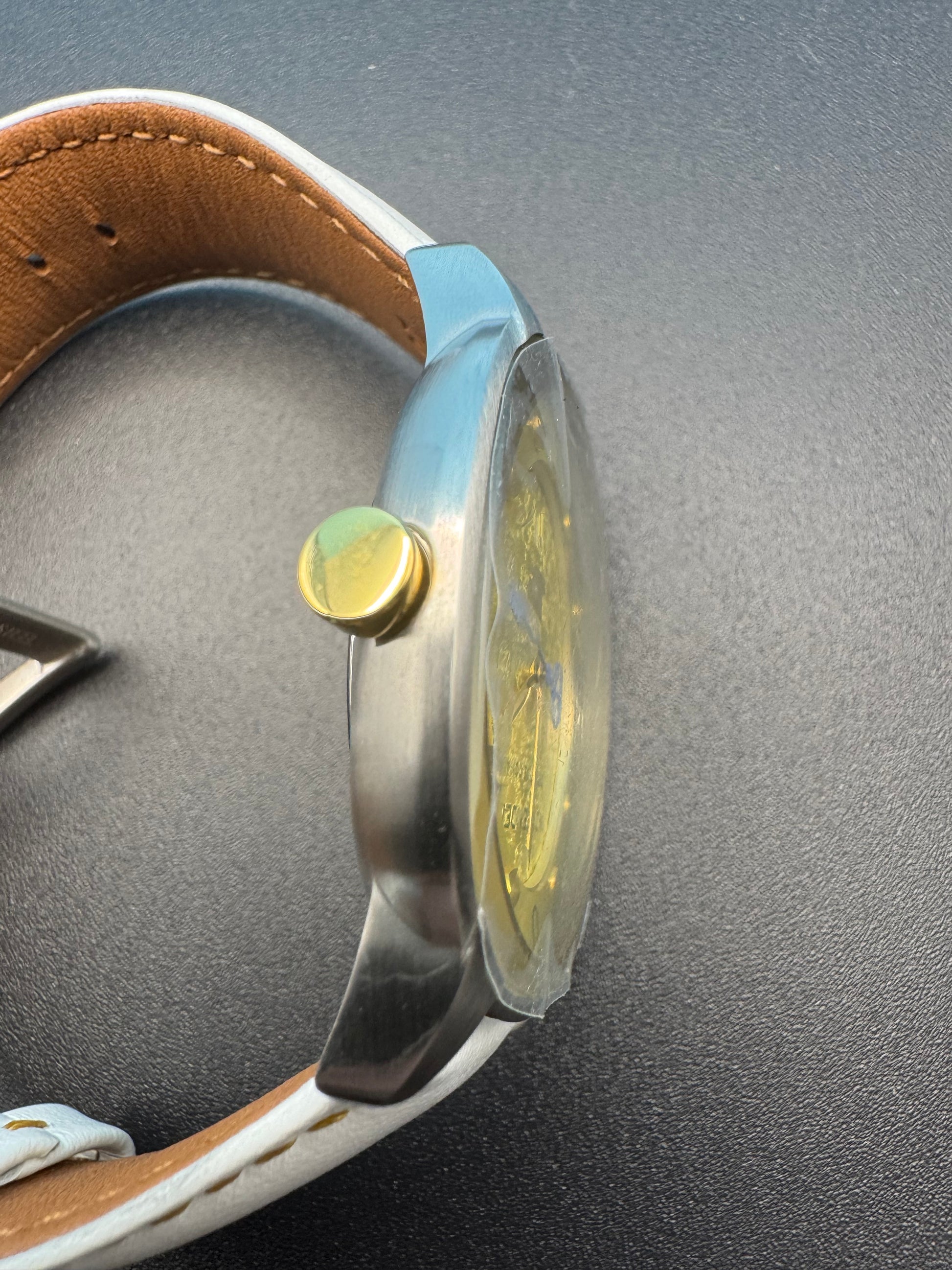 - Goldgelbes Zifferblatt mit floraler Reliefstruktur, Amuro-Symbolik (Tasse/“Café Poirot“), blauer Sekundenzeiger.