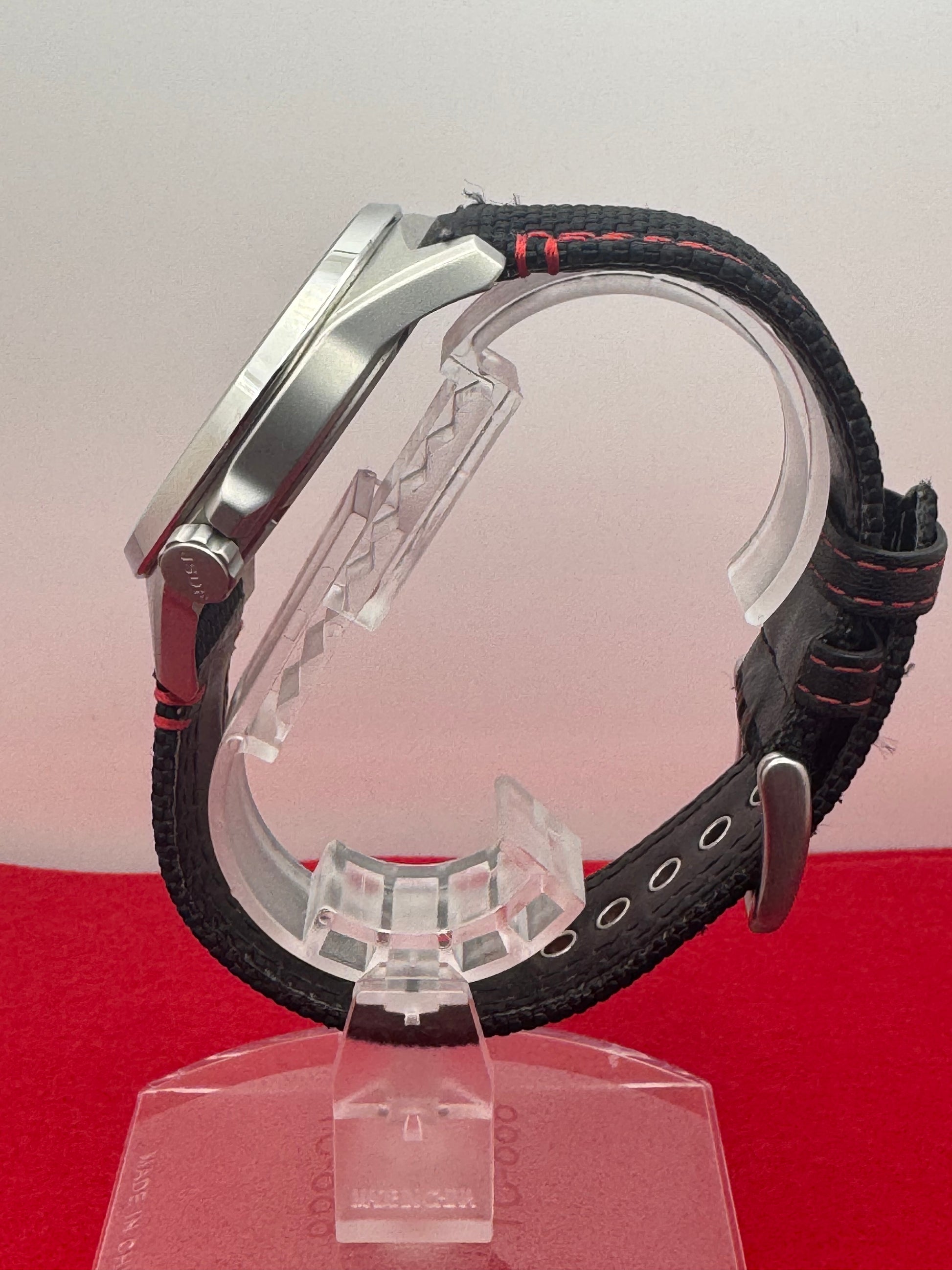 Das Zifferblatt trägt das offizielle JMSDF-Emblem sowie den Schriftzug Japan Maritime Self-Defense Force, das Gehäuse ist aus satiniertem Edelstahl gefertigt. Das originale Textil-/Leder-Hybridband mit roter Kontrastnaht und JSDF-Gravur an der Dornschließe betont den militärischen Charakter.