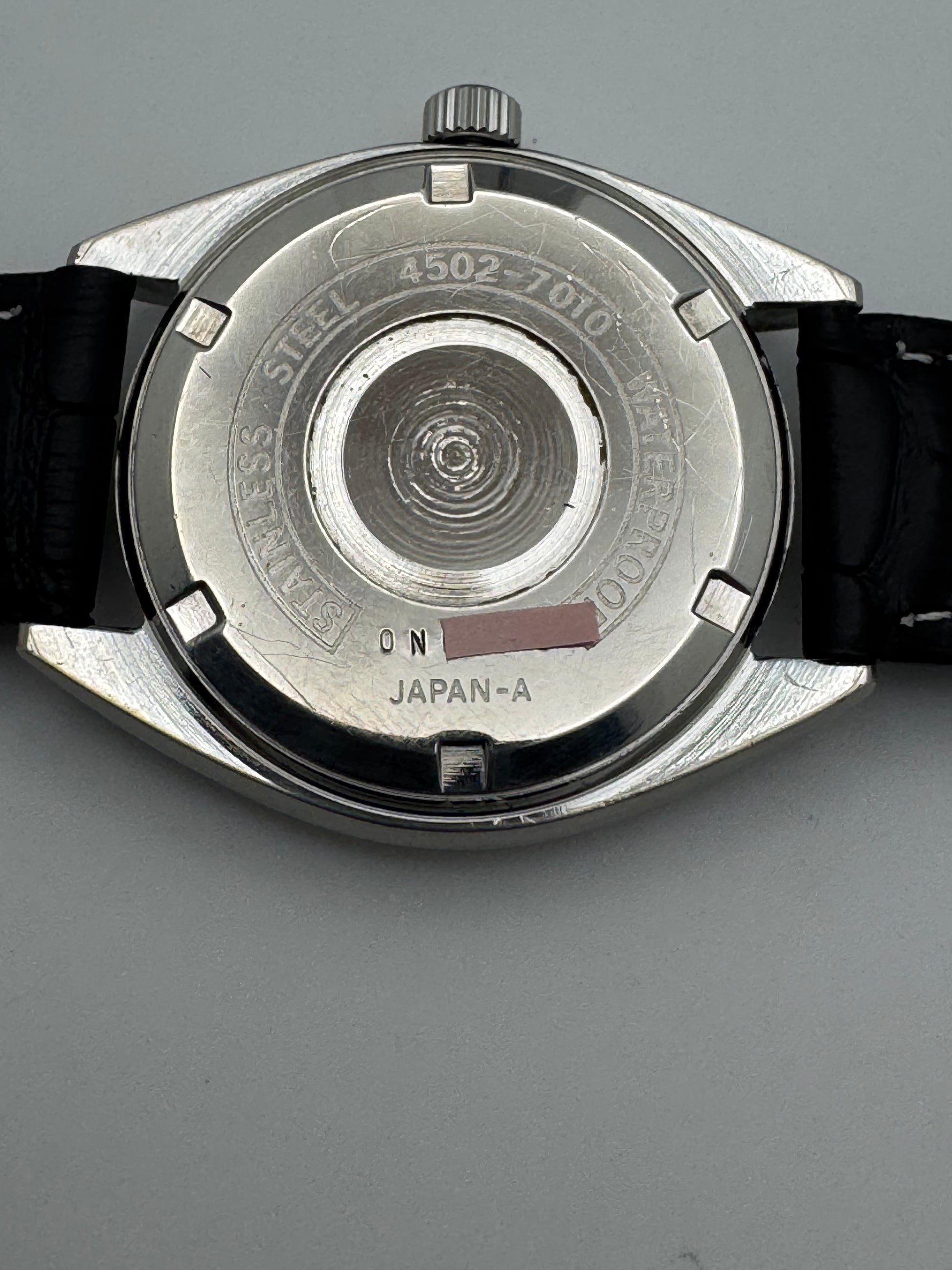 Die King Seiko 4502-7010 wurde vom Daini Seikosha-Werk produziert und gehörte zu den letzten rein mechanischen King Seiko-Modellen, bevor die Quarzära begann. Das Hi-Beat-Kaliber 4502A arbeitete mit 36.000 Halbschwingungen pro Stunde und war ein technisches Meisterwerk seiner Zeit – entwickelt, um höchste Gangpräzision zu erreichen.