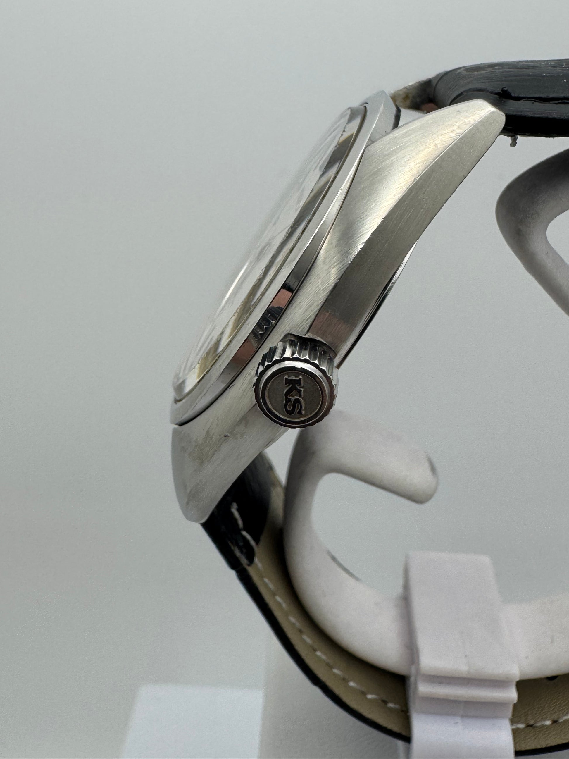 Sehr guter Zustand mit nur leichten Gebrauchsspuren. Das Gehäuse zeigt scharfe Kanten, das Zifferblatt ist original und hervorragend erhalten. Die Krone trägt das originale KS-Logo, die Bodenplakette fehlt, was bei diesem Modell häufig der Fall ist. Das neue Lederband ergänzt den eleganten Auftritt perfekt.