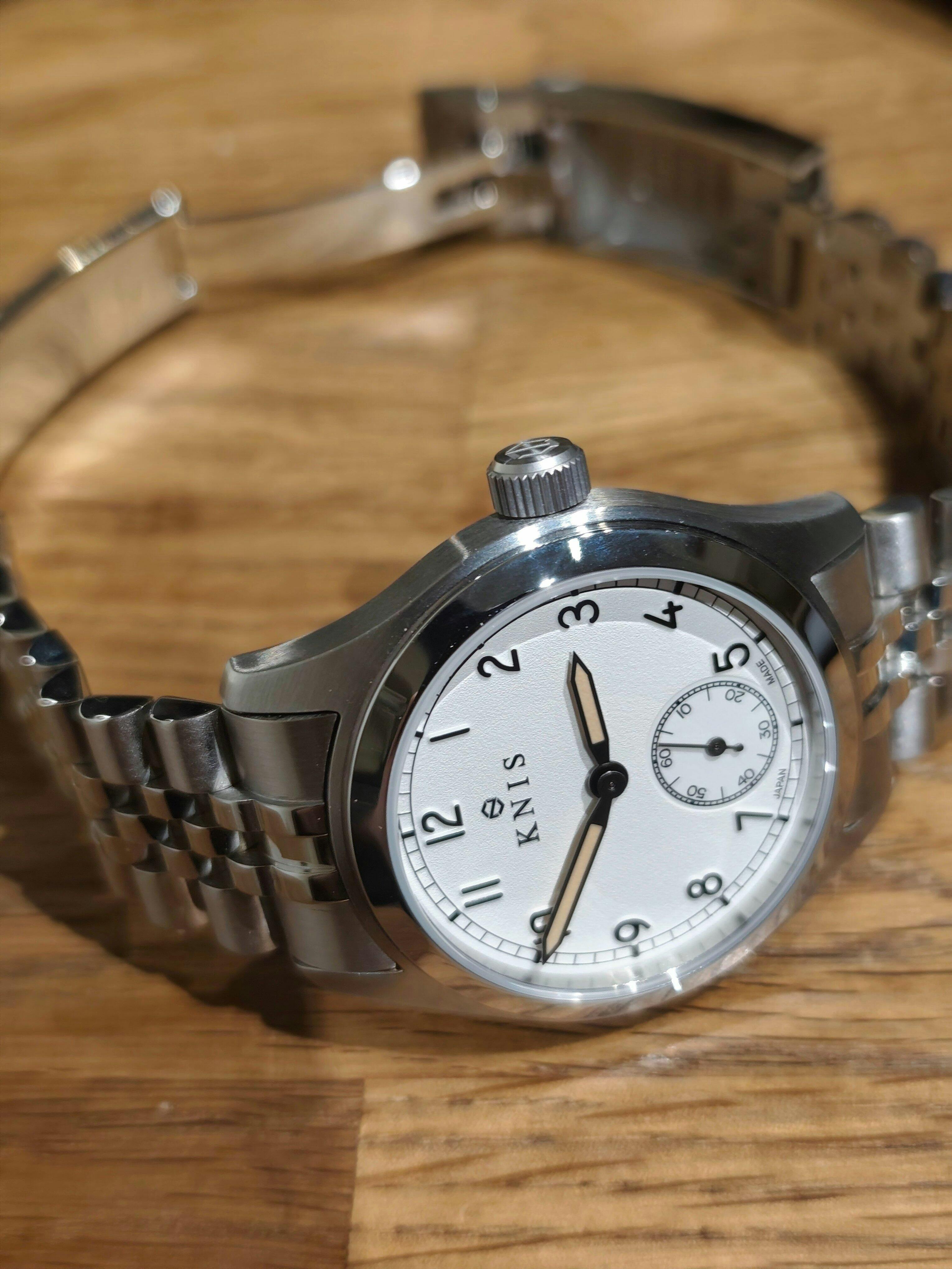 Normalerweise bin ich die ganzen Jahre an Uhren mit Durchmesser von 36, 38mm einfach vorbeigegangen. (Arm Umfang 20,5-21cm, Auflage ca. 55+mm) Dann hab' ich mir ein paar Videos vom Mario Lenke angeschaut. Ich weiß nicht wie Er das macht, über fernhypnose, auf jeden Fall schaute ich mir einige seiner Videos über japanische Uhren, auf seinem Kanal an. Und war sofort begeistert über soviel Professionalität und ließ mich von den teilweise wunderschönen Uhren überzeugen. Also lange Rede kurzer Sinn, ich fuhr vorgestern nach Mühltal, habe mir den Laden angeschaut (sensationell schön) und habe mir 3 von den japanese Microbrands gekauft. Eine davon seht ihr auf den gezeigten Bilder, müsste natürlich gleich die erste Modifikationen an der Knis Retro Military vornehmen. Ich tauschte das Stahlband gegen ein, für mich schöneres aus. Das wird sicherlich nicht der letzte Besuch bei Mario gewesen sein. Weiterhin gute Geschäfte und herzliche Grüße aus Frankfurt am Main Jürgen W. Daniel