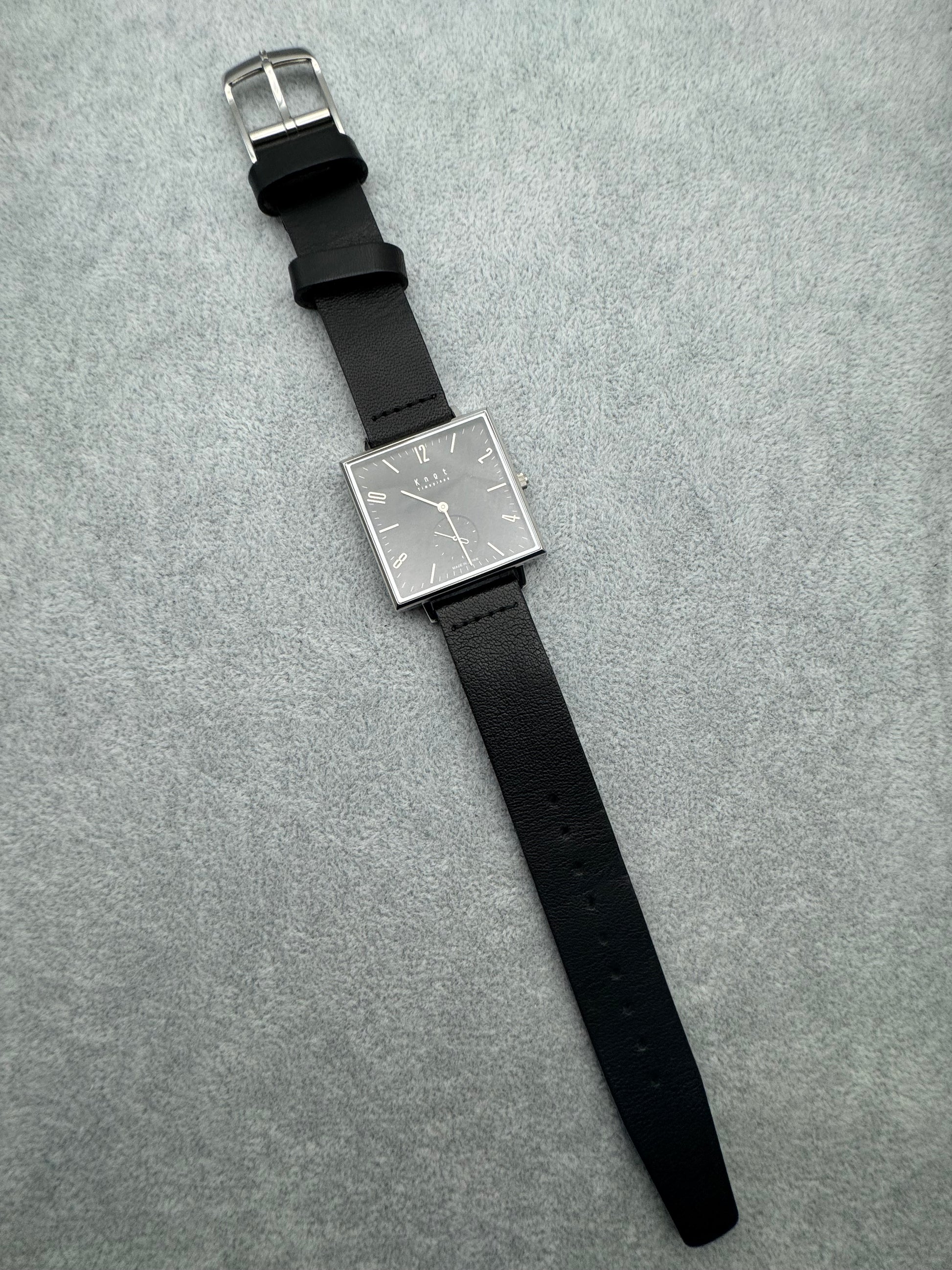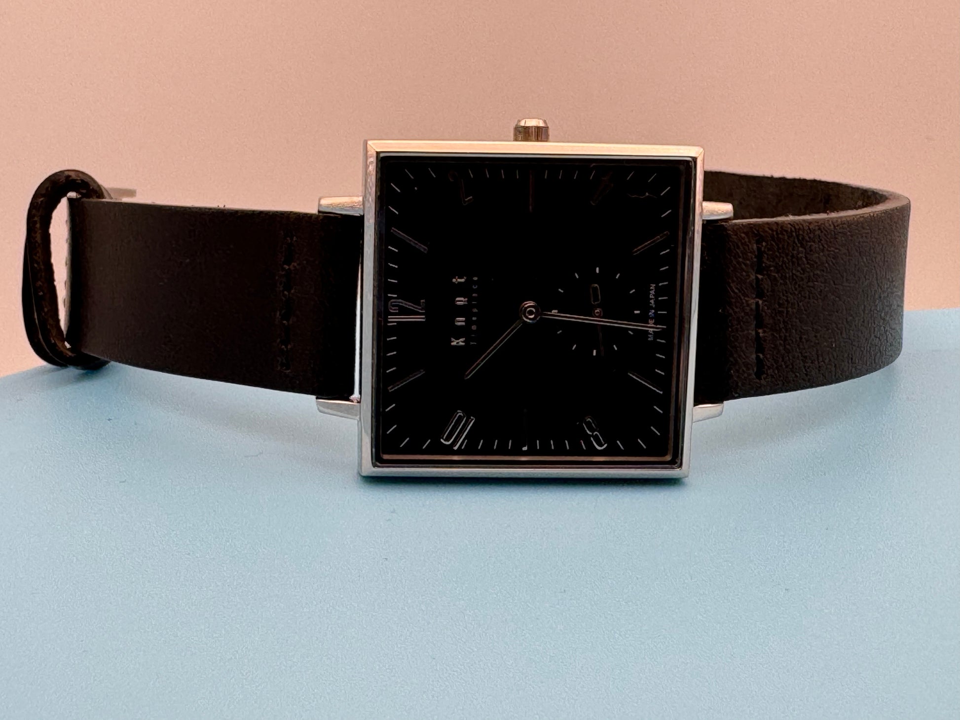 Das quadratische Edelstahlgehäuse mit polierten Kanten und das tiefschwarze Zifferblatt mit dezenten Appliken und kleiner Sekunde bei 6 Uhr verleihen dieser Uhr eine zurückhaltende, aber unverwechselbare Präsenz.