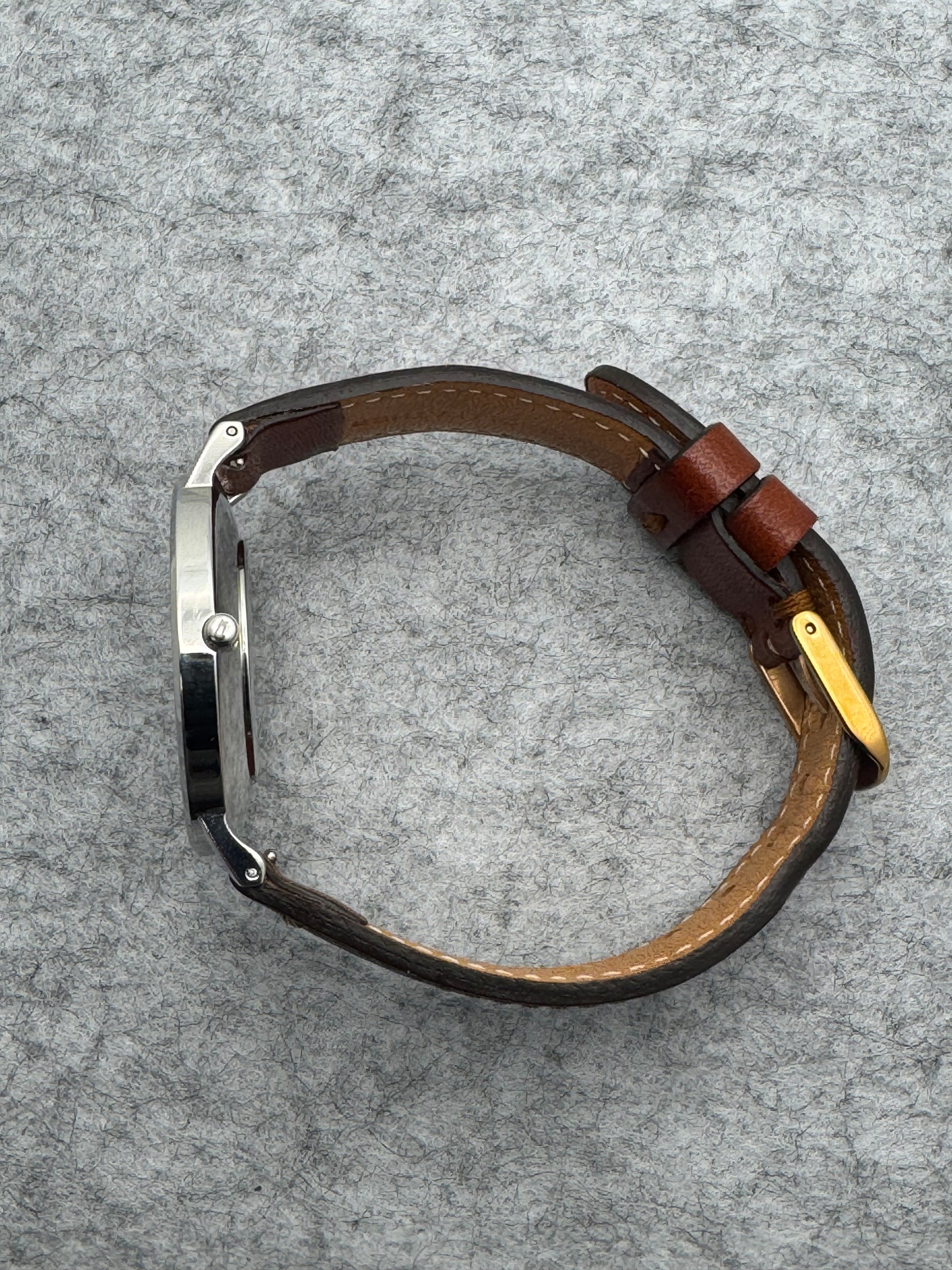 Die Knot CS-36 mit tiefblauem Zifferblatt ist ein Paradebeispiel für die moderne japanische Uhrmacherkunst – minimalistisch, präzise und hervorragend verarbeitet. Das Modell überzeugt durch seine schlanke Bauweise, das klare Design und das harmonische Zusammenspiel aus blauem Zifferblatt und cognacfarbenem Lederband.