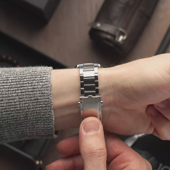 - Armband: Edelstahlarmband mit Schnellwechselsystem und verschraubten Bandgliedern