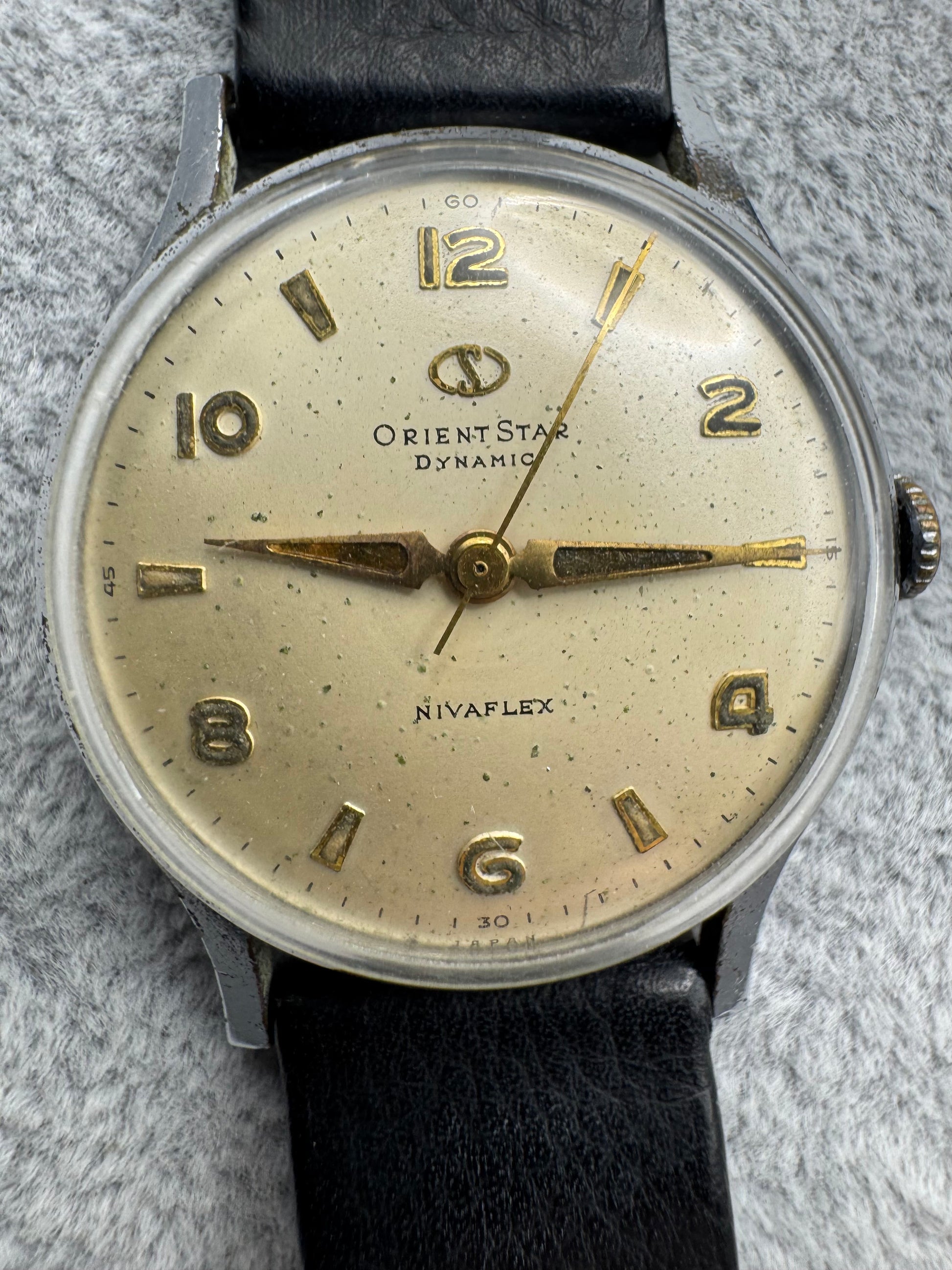 Seltene frühe Orient Star „Dynamic“ mit dem legendären Nivaflex-Handaufzugswerk, gefertigt in den späten 1950er-Jahren, kurz nach Gründung der Marke Orient Star (1951). Dieses Modell zählt zu den bedeutendsten Zeitzeugen der japanischen Nachkriegsuhrenindustrie und gilt als Sammlerklassiker für Liebhaber früher Orient-Modelle.
