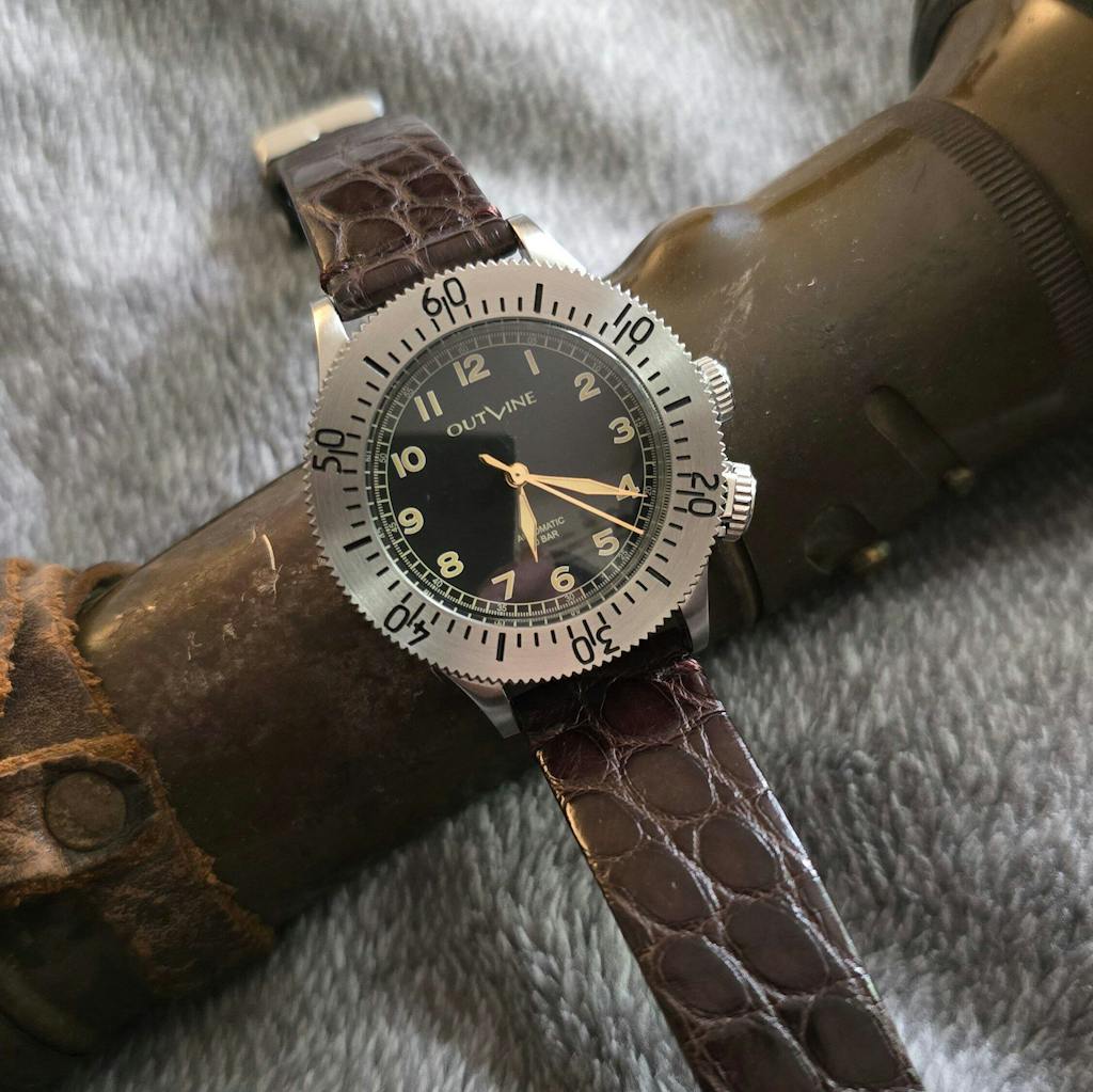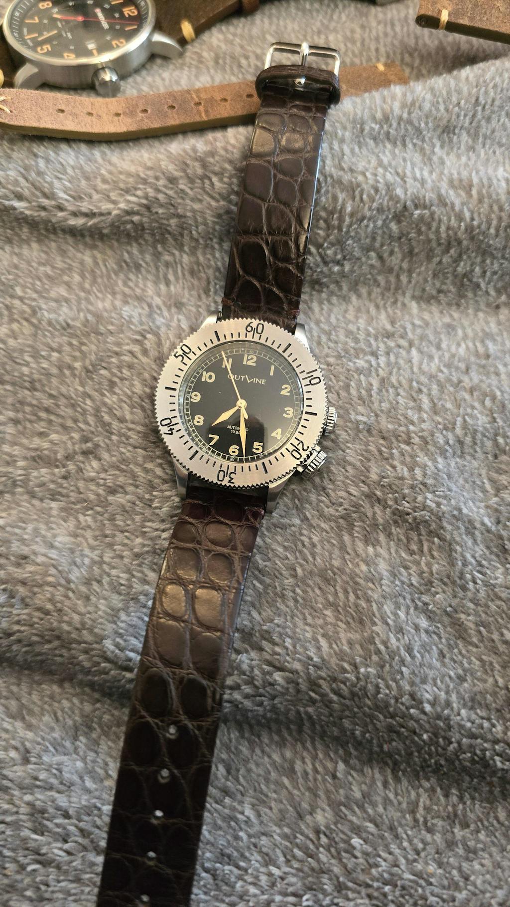 Kam sehr gut verpackt an mit guter Sendungskommunikation. Hatte auch ein sehr angenehmes Vorgespräch zur Uhr mit dem Verkäufer. Ich bin sehr zufrieden, tadellos verarbeitet, Ganggenauigkeit nach einer Woche tragen bis jetzt sehr gut ( keine Halbe Minute Vorlauf, ist aber noch in der Einlaufphase ). Grösse ist bei meinem Handgelenksumpfang von 19,5 cm noch gut tragbar. Zum Hemd getragen, verschwindet sie aber gerne unter der Manschette. Ich habe Sie derzeit mit einem Marone farbigen Vintage Stil Krokoband ausgestattet da das Originalband bei meinem Hautton zu blass/fade wirkt. Ein schwarzes Band im Stile meines Braunen würde der Uhr perfekt stehen für einen edelen Vintage Look. Ich konnte mich nicht zurückhalten sie auch fotografisch richtig einfangen zu wollen.