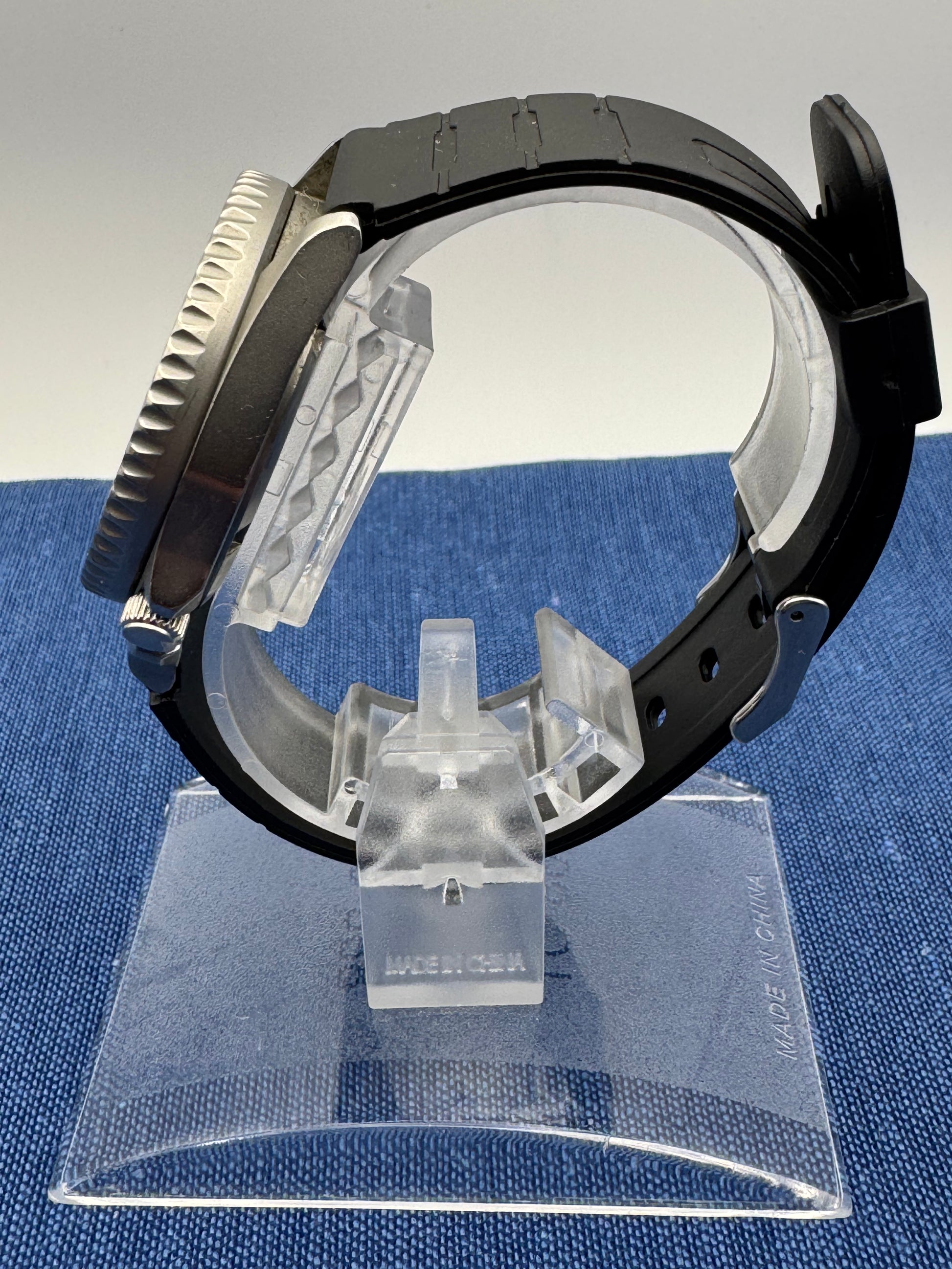 Äußerst seltene japanische Taucheruhr mit ungewöhnlicher Mondphasenanzeige von Omron Japan, Modell MM38, gefertigt in den frühen 1980er-Jahren. Diese Uhr verbindet auf einzigartige Weise technische Funktionalität (20 BAR Wasserdichtigkeit) mit einer astronomischen Komplikation – eine Kombination, die selbst unter Vintage-Diver-Modellen extrem selten ist.