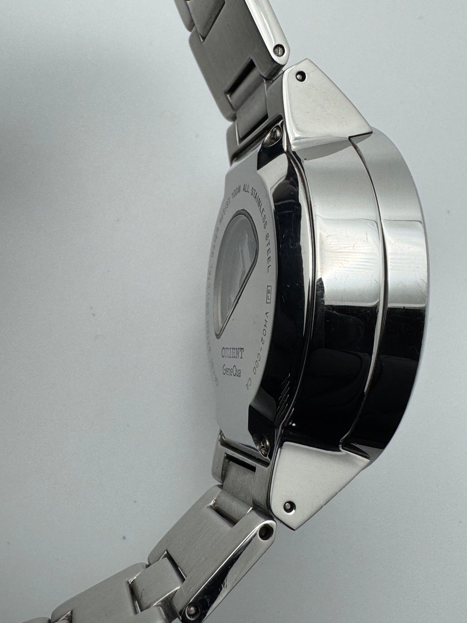 Diese außergewöhnliche Orient GeneQua (Ref. YH03-COO) ist eine der technisch innovativsten Uhren, die die Orient Watch Co., Ltd. je produziert hat. Sie kombiniert ein automatisches Uhrwerk mit integriertem Generator und ein präzisionsgeregeltes Quarzmodul – ein hybrides System, das sowohl die Energieeffizienz mechanischer Antriebe als auch die Genauigkeit elektronischer Zeitmessung vereint.