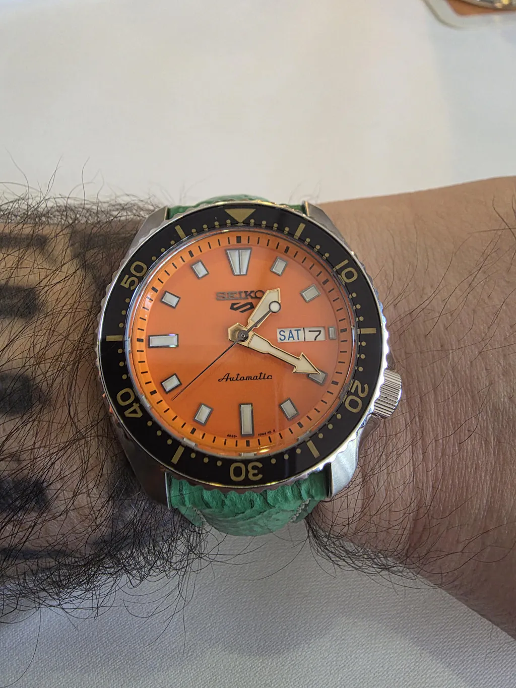 Die Seiko 5 Sports SRPL89K1 „Samegawa“ (鮫皮) kombiniert ein leuchtend oranges Zifferblatt mit einem grünen Haifischlederarmband. Das wirkt im ersten Moment wild – passt aber erstaunlich gut, weil Orange und Grün sich gegenseitig gegenseitig „pushen“ und der Uhr sofort mehr Spannung geben.
