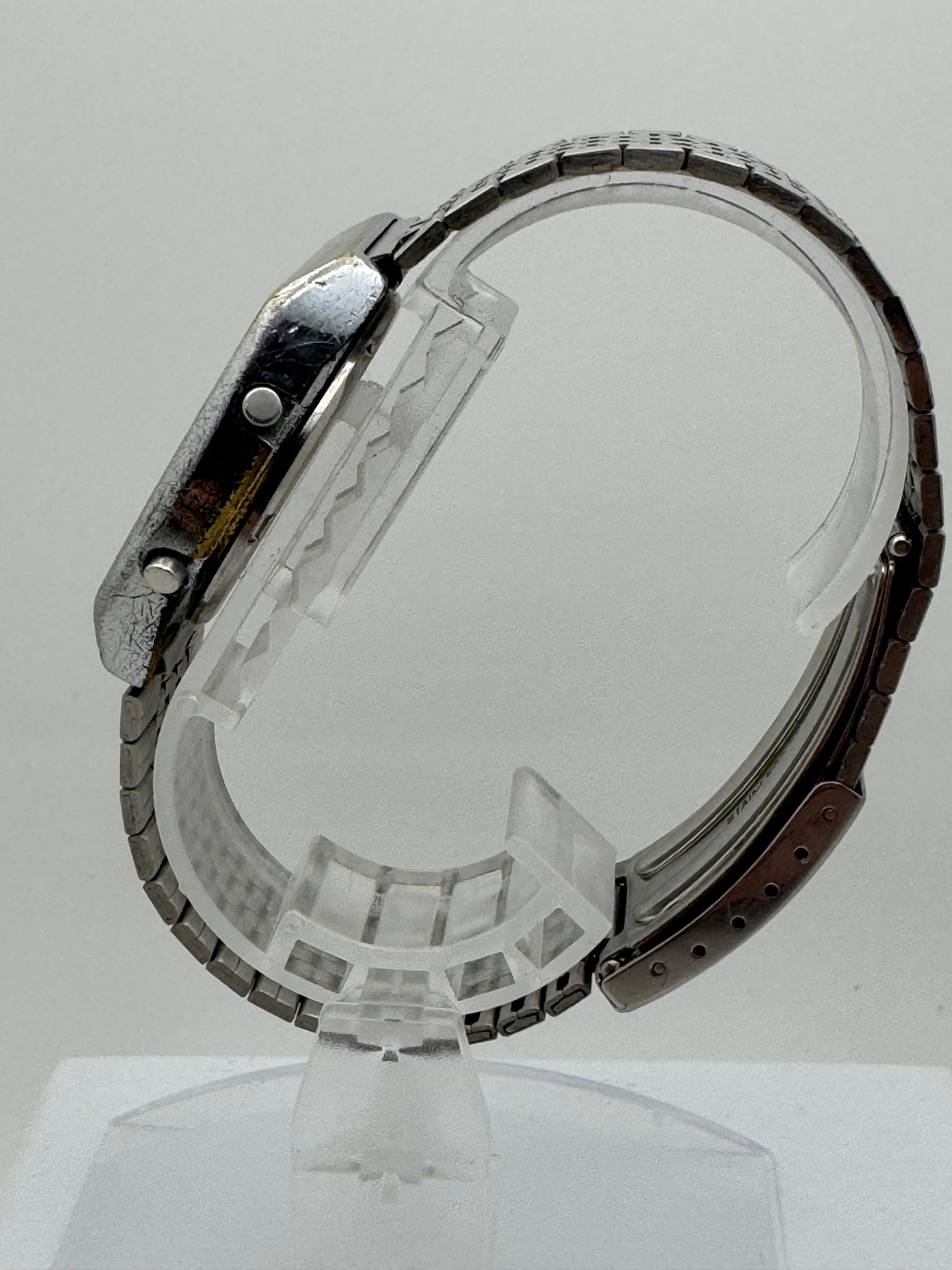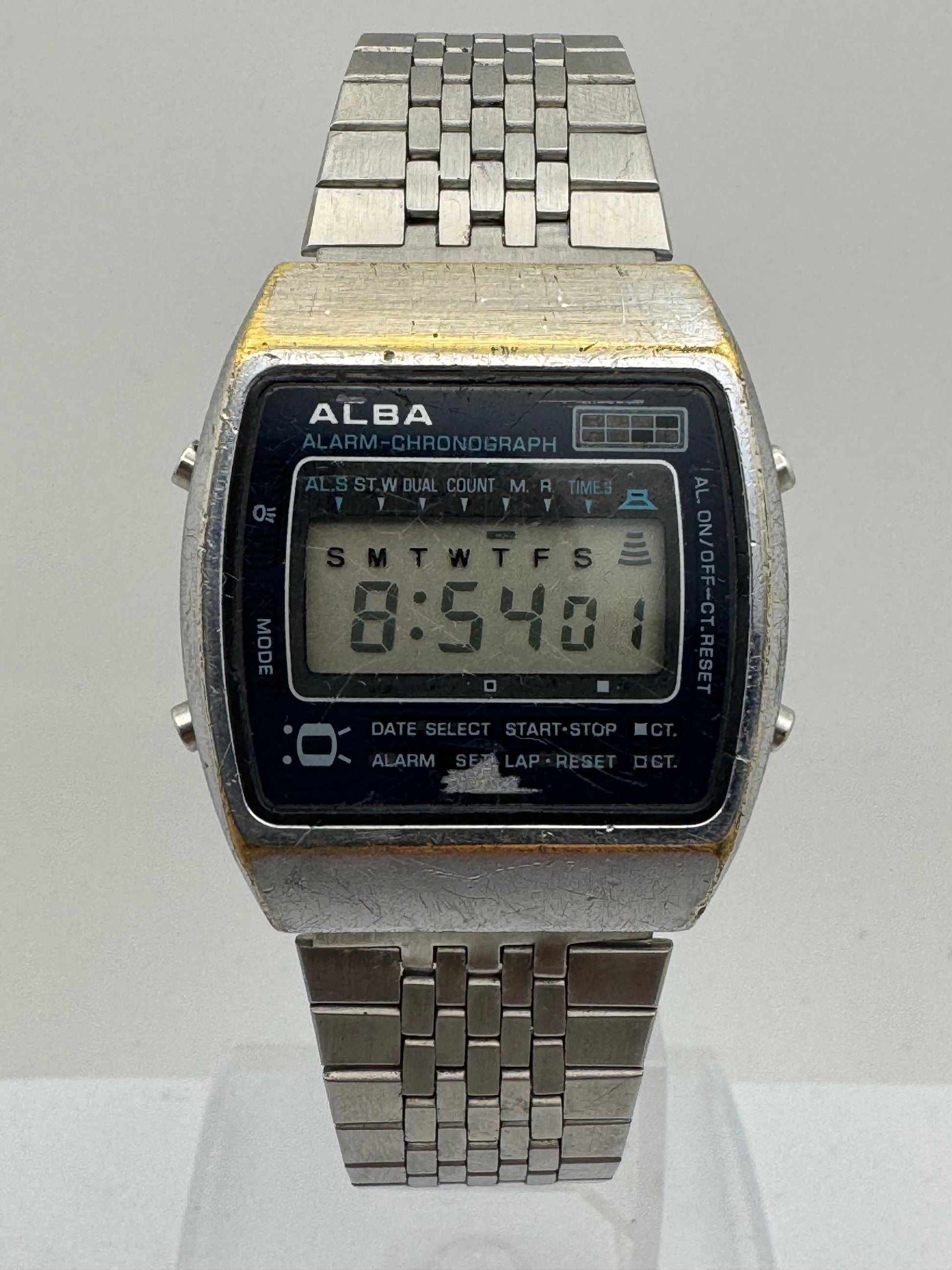 Diese digitale Armbanduhr der Seiko-Tochtermarke ALBA stammt aus dem Jahr 1981 und ist ein eindrucksvolles Beispiel für das japanische Uhrendesign der frühen 1980er-Jahre. Sie wurde im November 2025 vollständig zerlegt, gereinigt und mit einer neuen Batterie sowie einer neuen Gehäusedichtung versehen. Das Gehäuse selbst wurde bewusst nicht poliert oder aufbereitet, um den authentischen, gelebten Charakter dieser Uhr zu bewahren.
