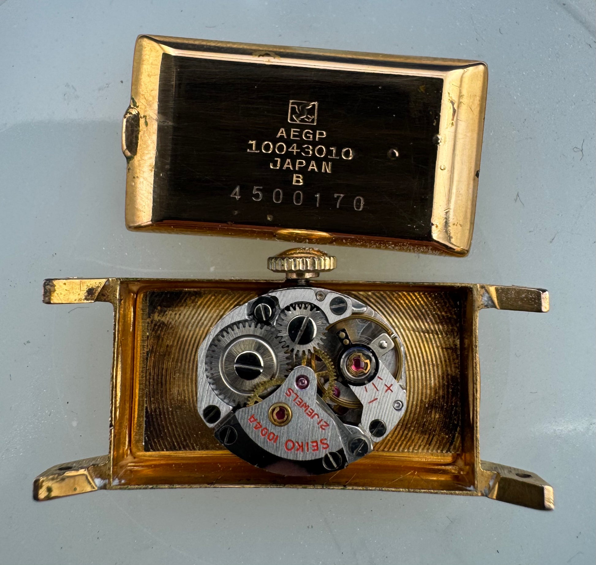 - Gehäuse: Vergoldet (AEGP), Edelstahlboden