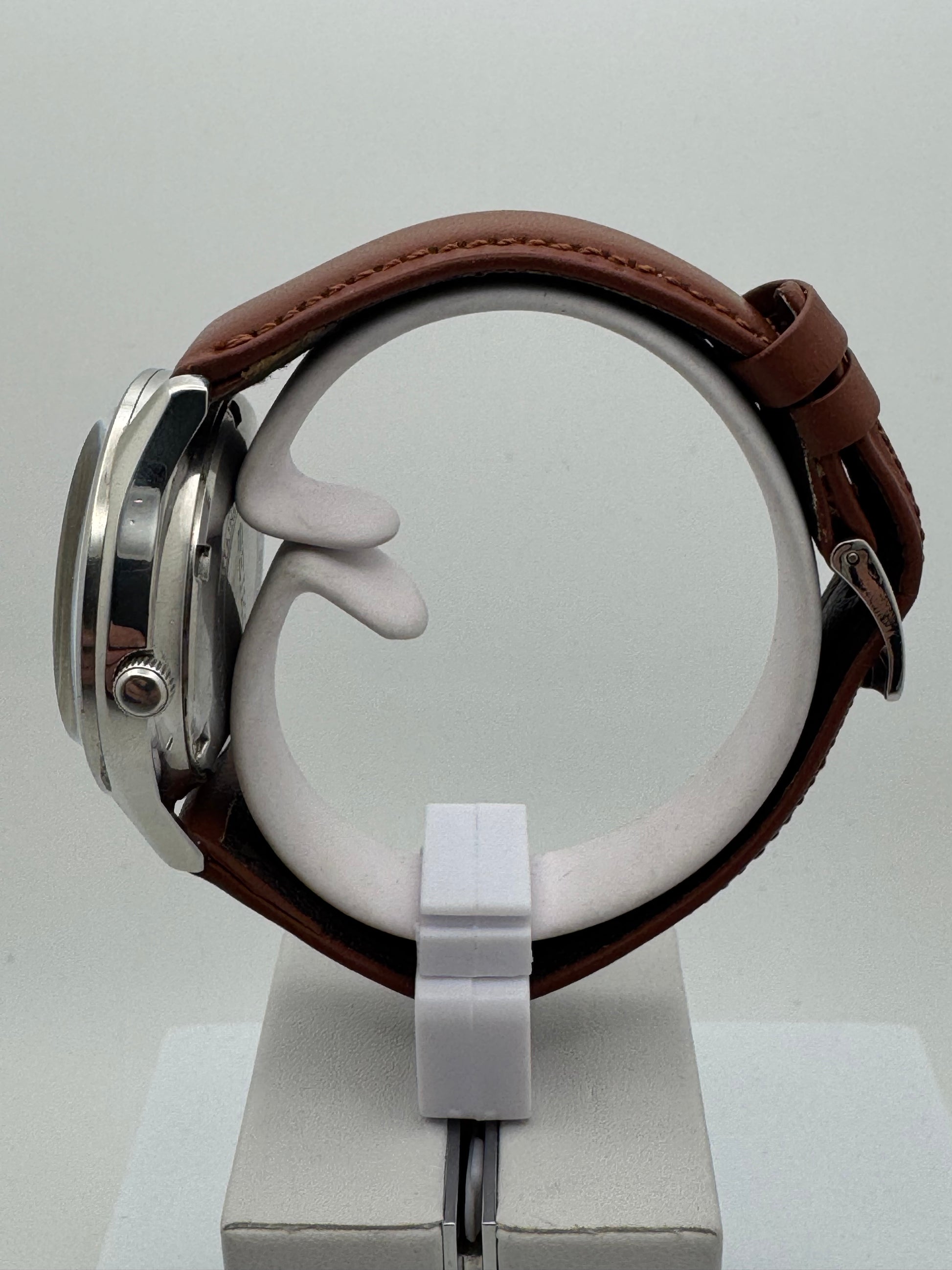 Das neue braune Lederarmband mit kontrastierender Steppnaht unterstreicht den klassischen Charakter dieser Vintage-Uhr und harmoniert perfekt mit dem warmen Glanz des Zifferblatts.