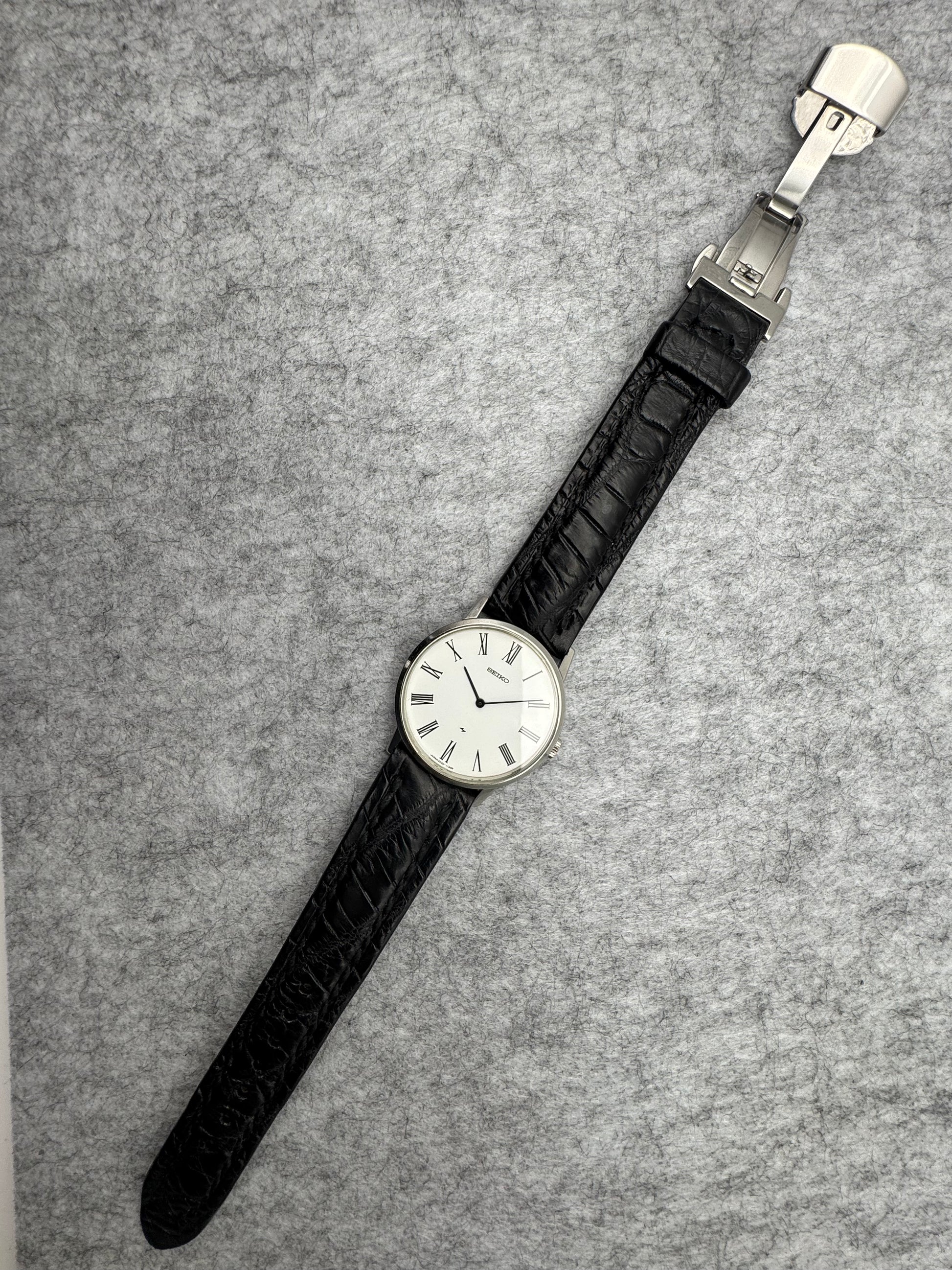 Mit ihrem nur 7,3 mm hohen Edelstahlgehäuse, dem klaren weißen Zifferblatt und den feinen römischen Ziffern gehört sie zu den stilreinsten Modellen, die Seiko je für den japanischen Markt produziert hat.