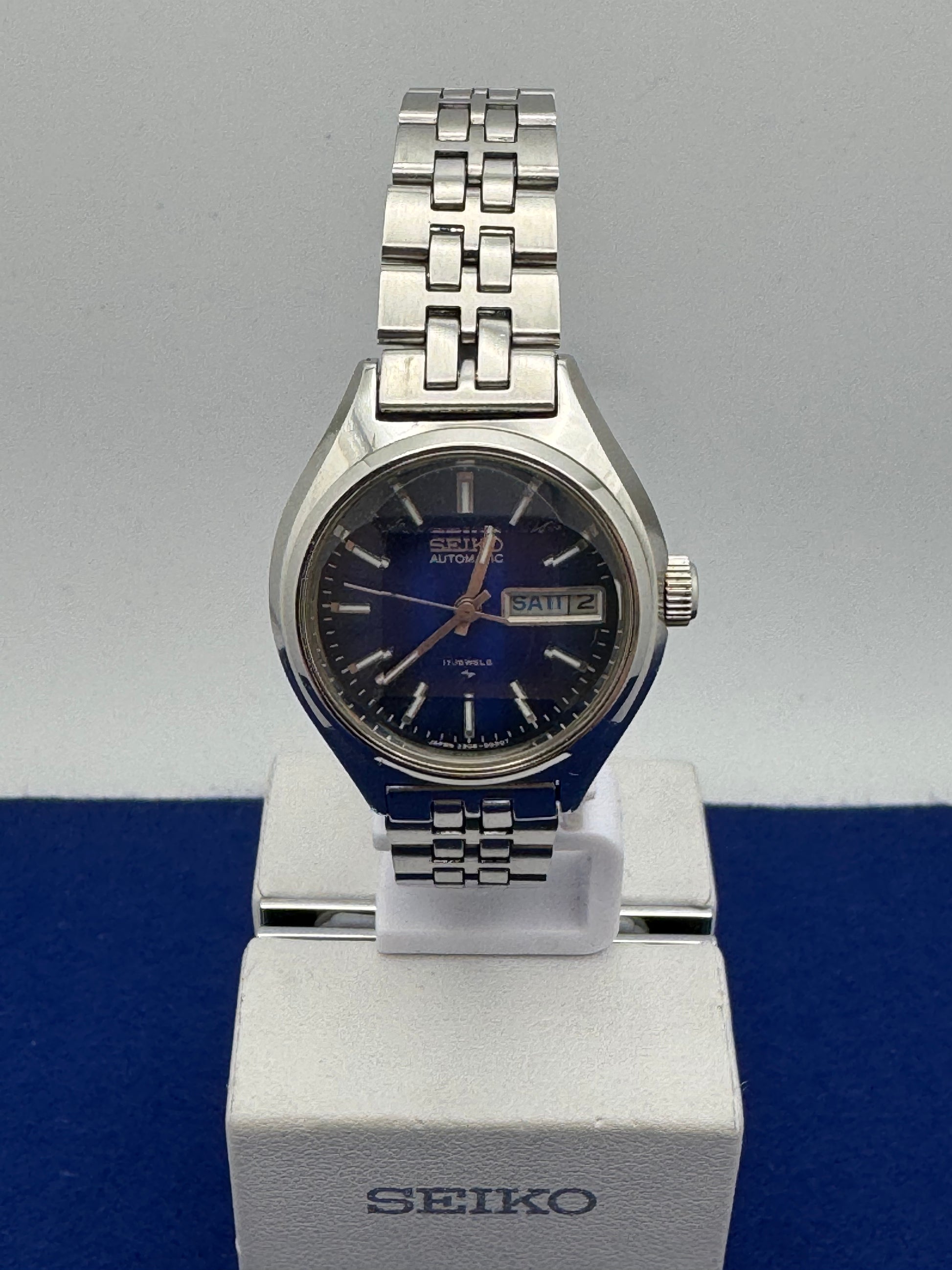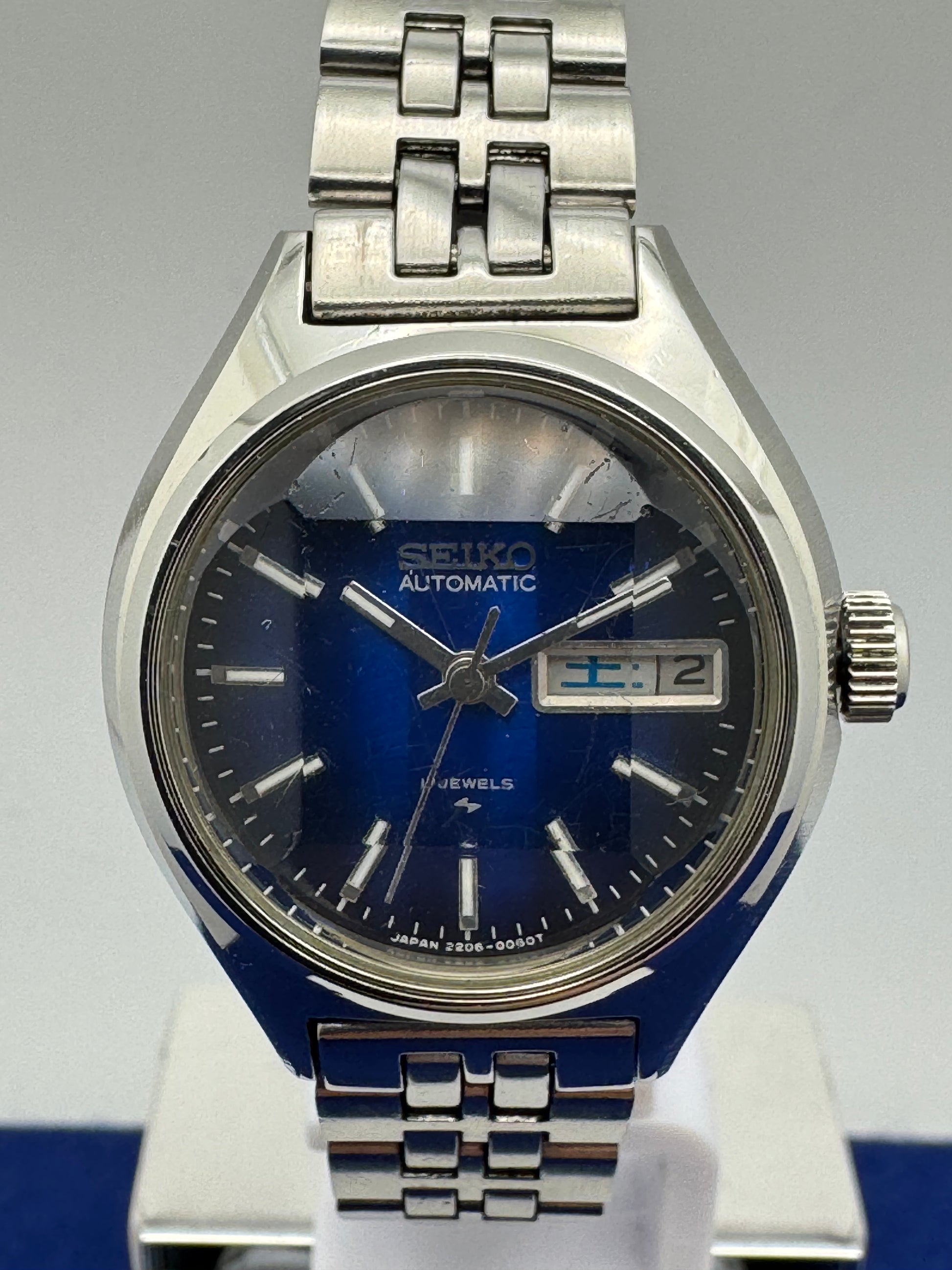 Diese elegante Seiko Automatic 2206-0050 stammt aus Oktober 1974, einer Zeit, in der Seiko seine Automatikkaliber auch in kleineren, fein proportionierten Damenuhren anbot. Das Modell besticht durch sein faszinierendes blau-metallisches Sonnenschliff-Zifferblatt, das – je nach Lichteinfall – von tiefem Mitternachtsblau bis zu hellem Azur changiert.