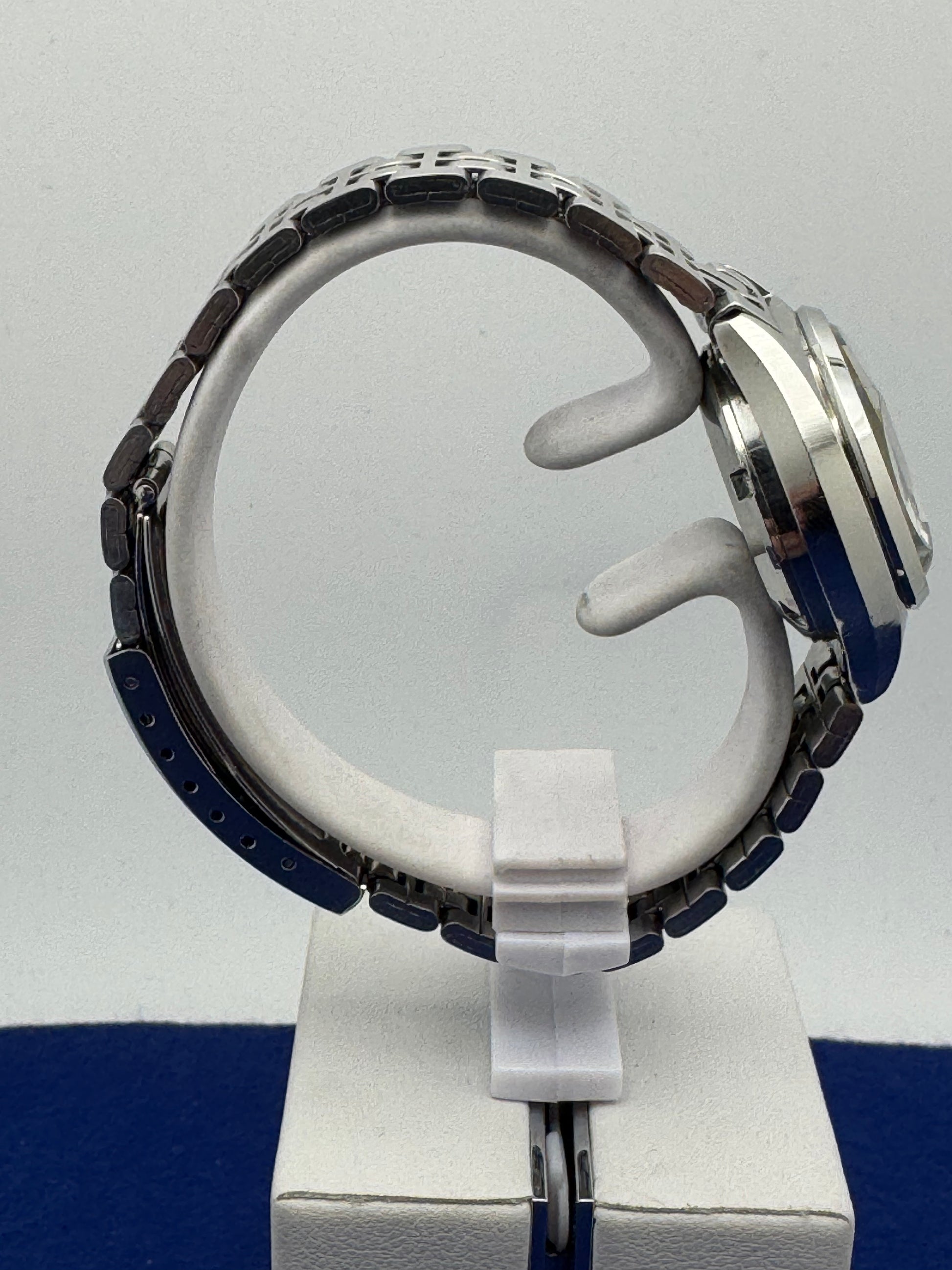 Das fünffach facettierte Mineralglas sorgt für ein einzigartiges Lichtspiel und betont die harmonische Gehäuseform. Das Gehäuse ist vollständig aus Edelstahl gefertigt, ebenso das originale Seiko-Edelstahlband mit Faltschließe, das sich durch seine feine Gliederstruktur angenehm trägt.