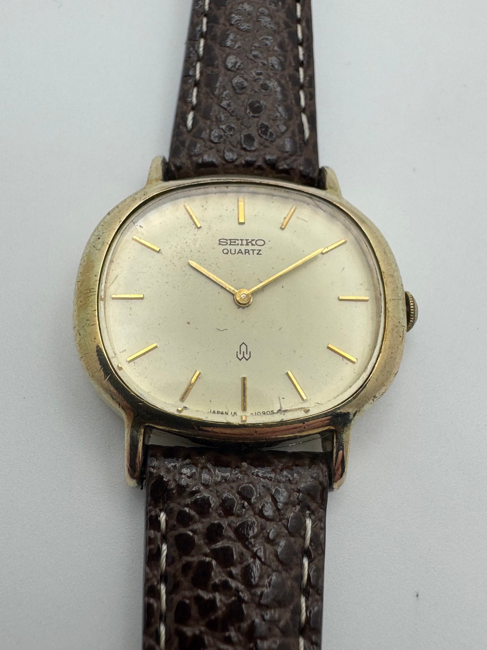 Diese elegante Seiko-Damenuhr der späten 1970er Jahre steht exemplarisch für die frühe Phase der japanischen Quarzrevolution. Das vergoldete Kissen-Gehäuse (Gold-Filled / SGP) kombiniert klassische Linien mit angenehm flacher Bauhöhe und einem dezenten, zeittypischen Zifferblatt in Champagner-Gold. Die Uhr stammt aus November 1978 (Seriennummer 833015 → „8“ = 1978, „3“ = März*) und ist mit einem neuen, originalen Seiko-Lederband ausgestattet. Die Batterie wurde im November 2025 erneuert.