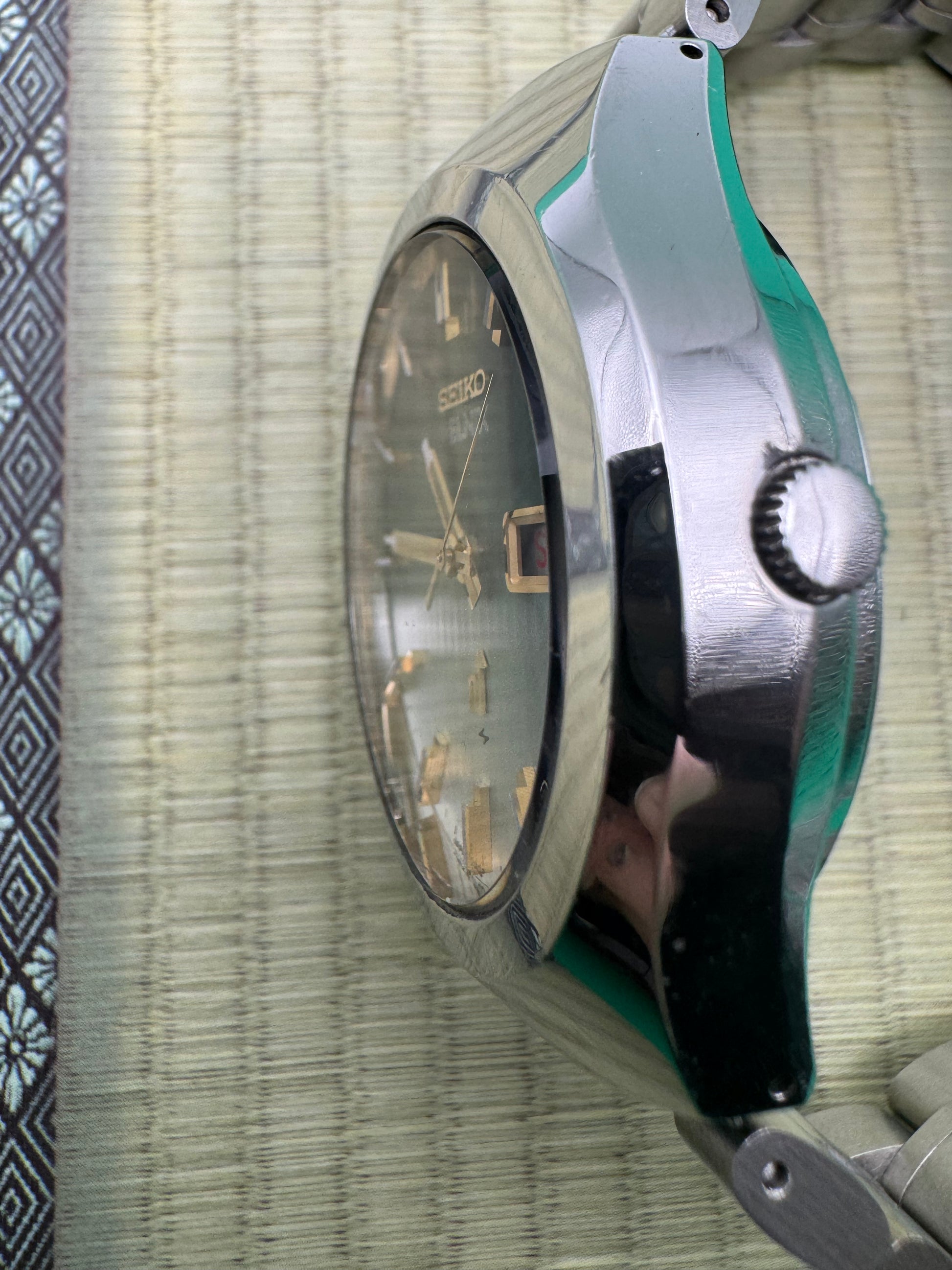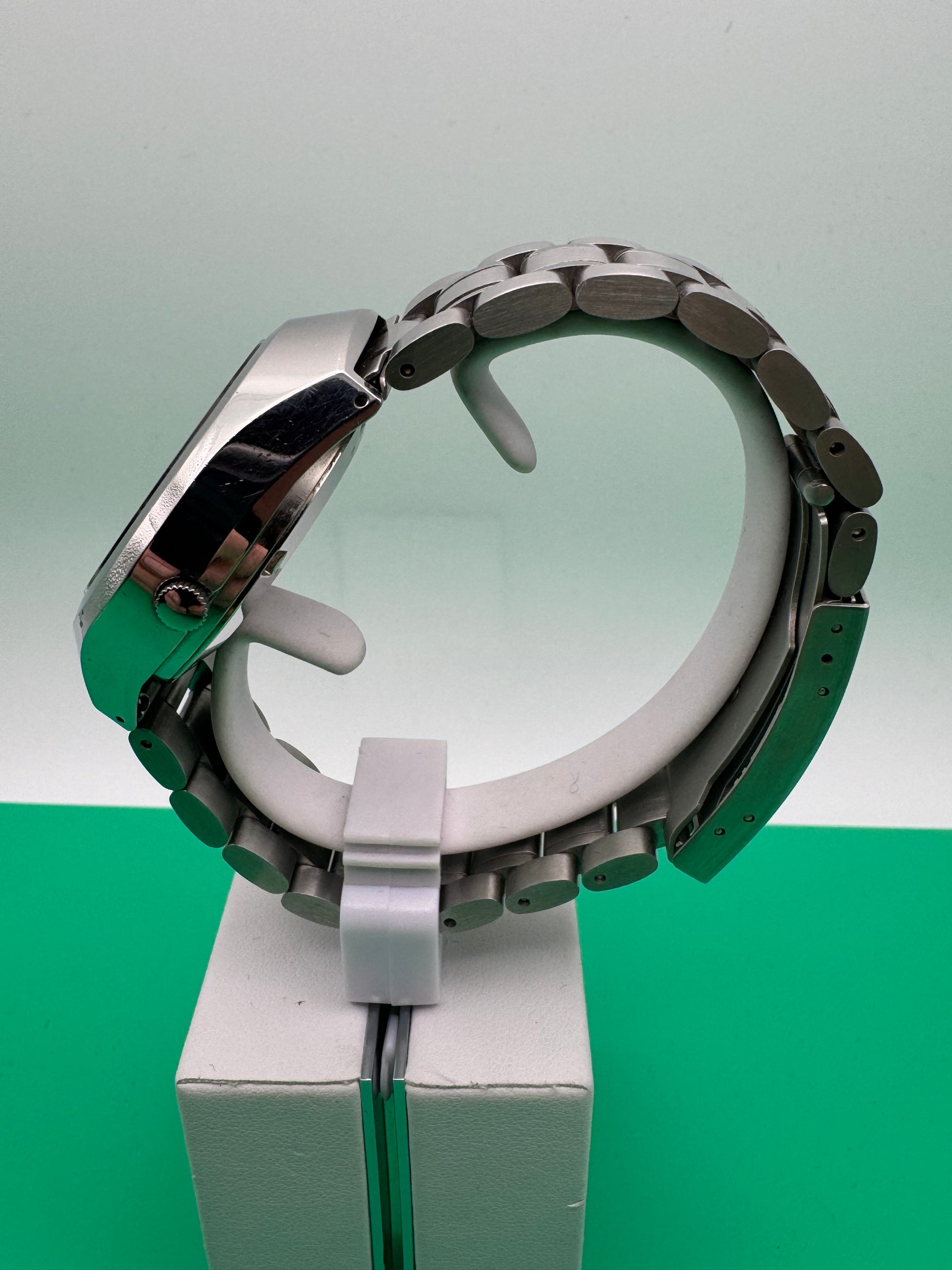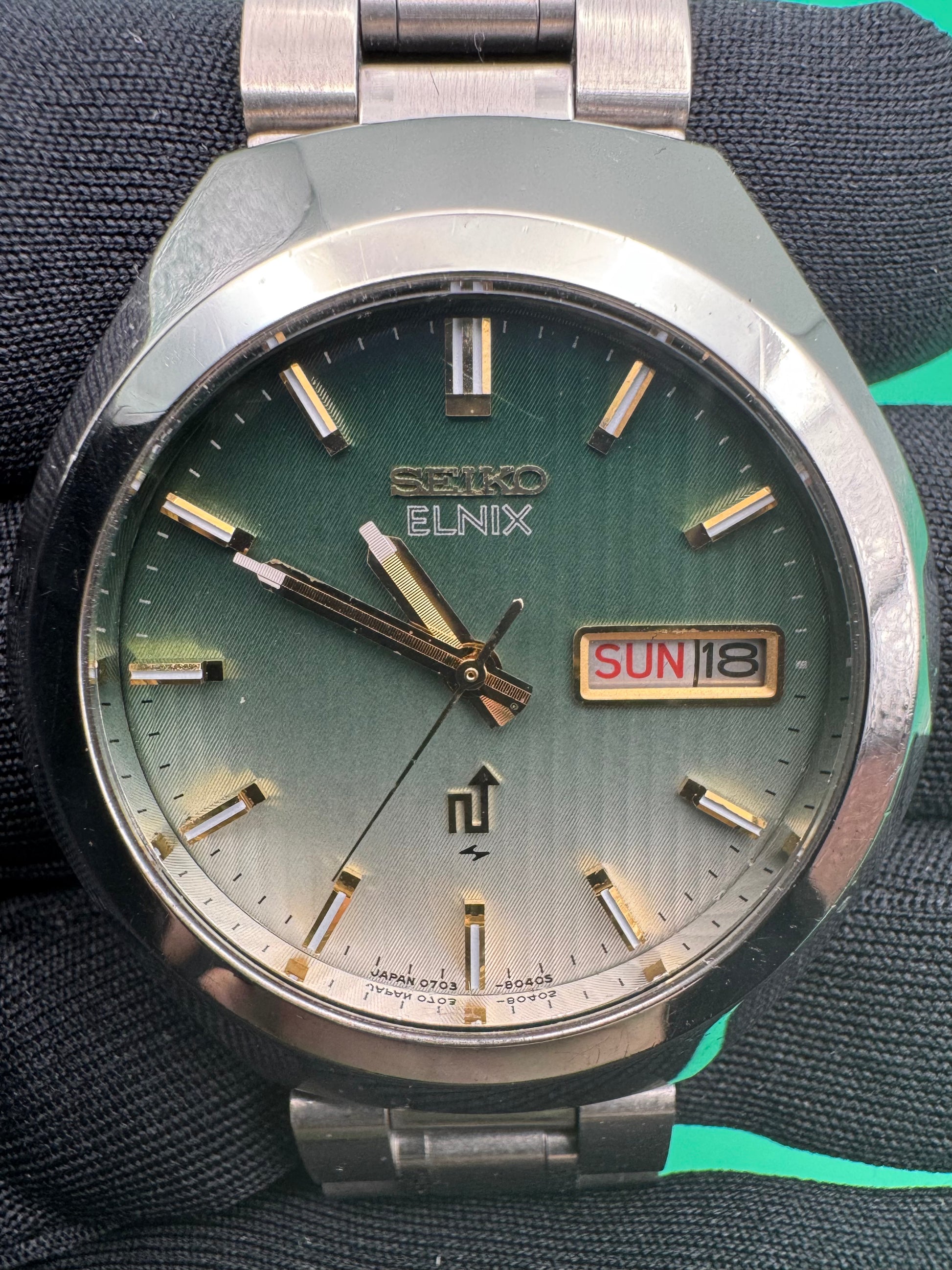 Sehr guter Erhaltungszustand für eine Elnix dieser Zeit. Das Zifferblatt zeigt lebhafte grün-silberne Reflexe, die Indizes und Zeiger sind sauber erhalten. Gehäuse mit leichten Gebrauchsspuren, Glas ohne tiefe Kratzer. Werk funktionstüchtig und mit neuer Batterie, Tag-/Datumsanzeige intakt. Aftermarket-Stahlband in passendem Stil und sehr gutem Zustand.