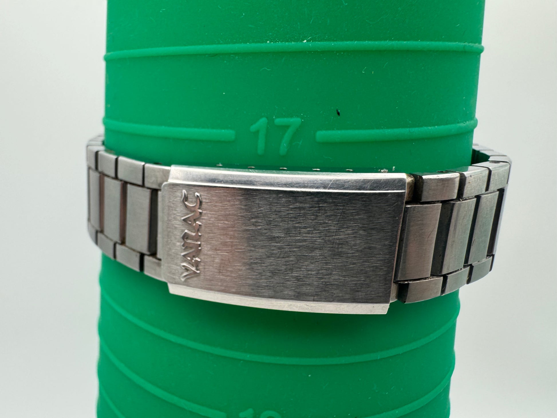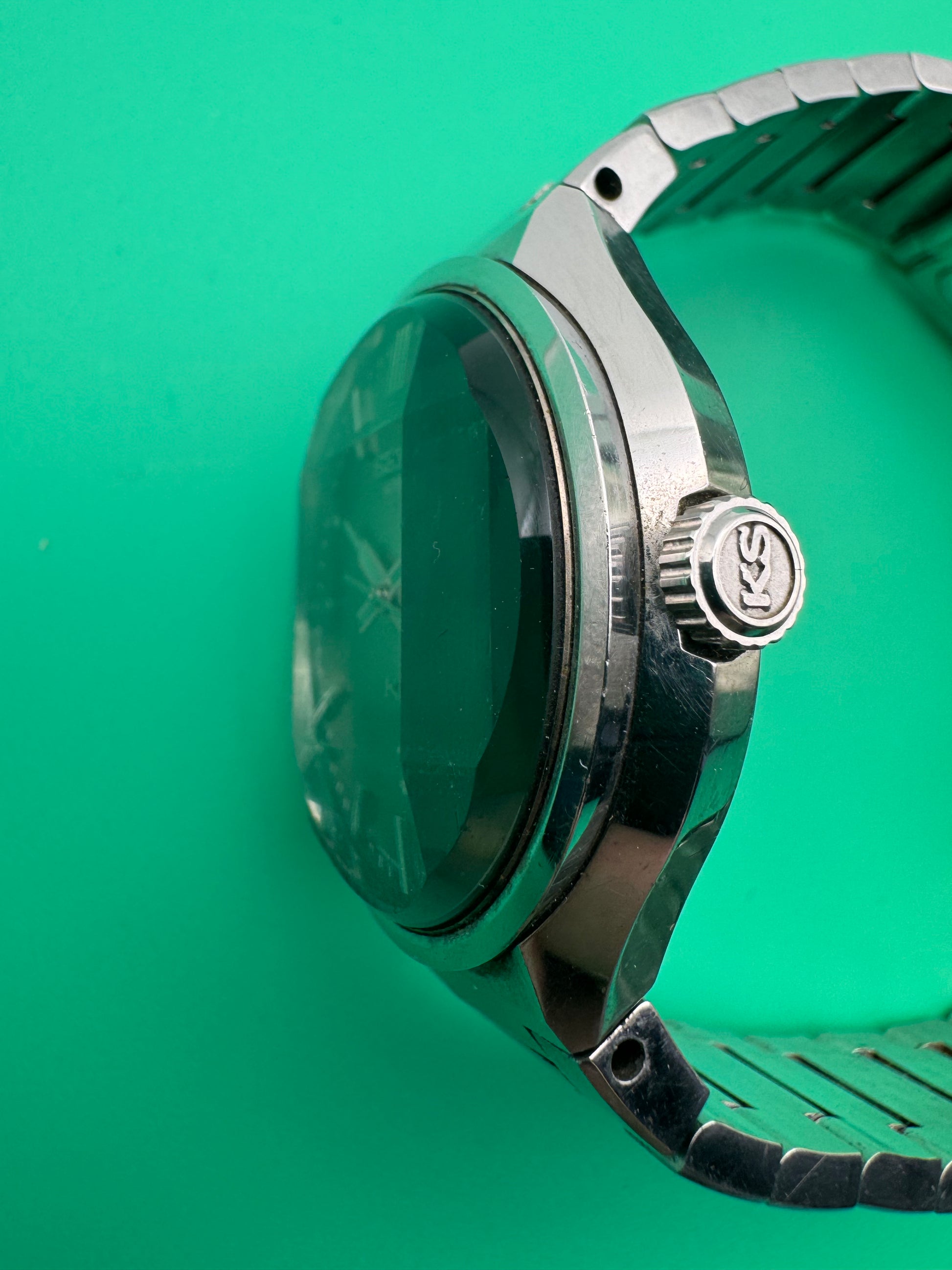 Das vorliegende Exemplar befindet sich in einem herausragend originalen Zustand, vollständig unpoliert mit scharfkantigem Gehäuse, klaren Fasen und dem selten intakten mehrfach facettierten Originalglas. Das Originalarmband mit „Vanac“-Signatur ist fest, praktisch ohne Dehnung, und die Originalkrone mit KS-Logo rundet den beeindruckenden Erhaltungszustand ab.
