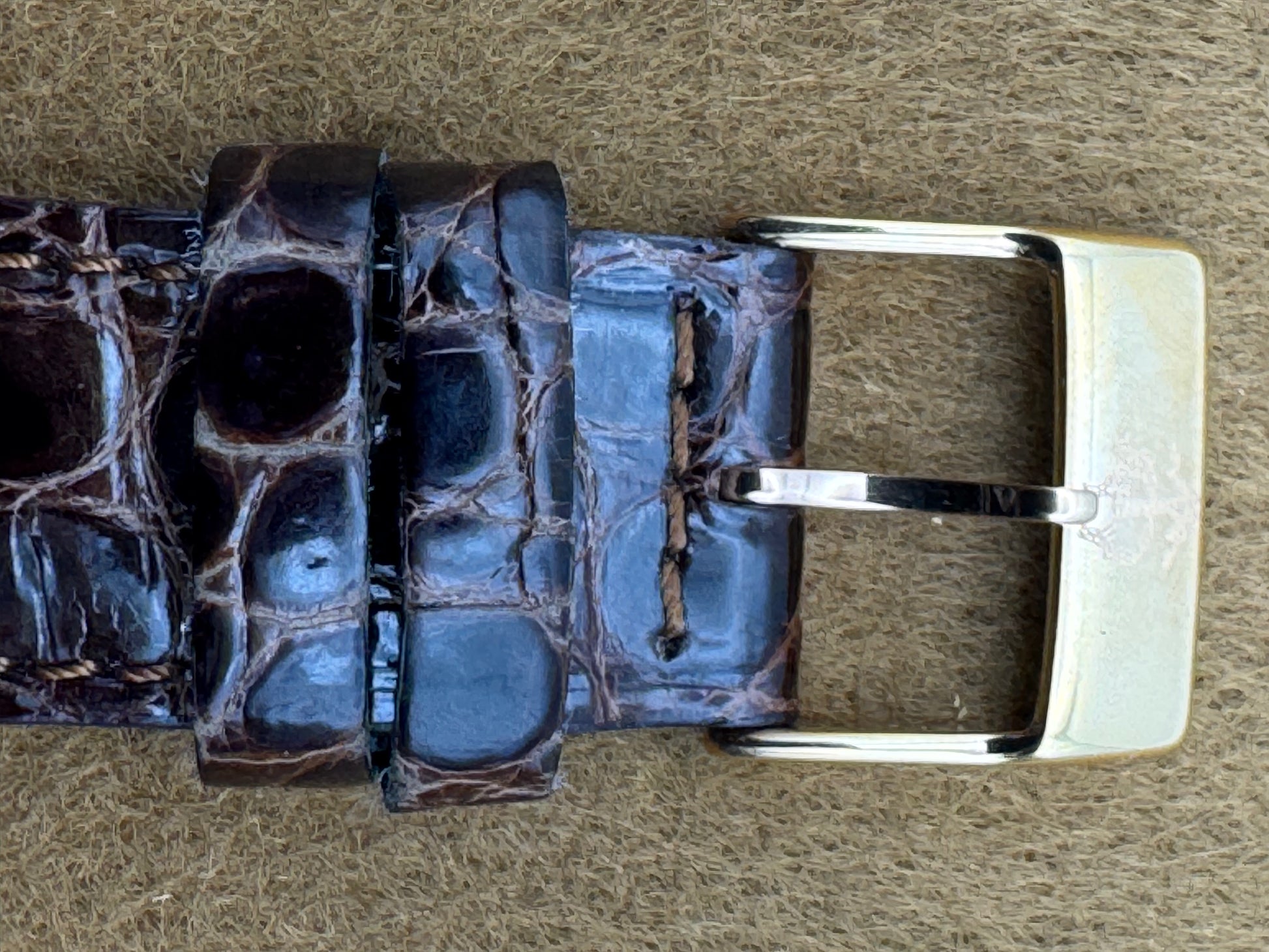 Hochwertiges Brooks Brothers-Lederarmband in dunkelbraunem Alligatorstil mit goldfarbener Dornschließe – eleganter Kontrast zum kühlen Stahlgehäuse. Das Armband befindet sich in nahezu neuwertigem Zustand.
