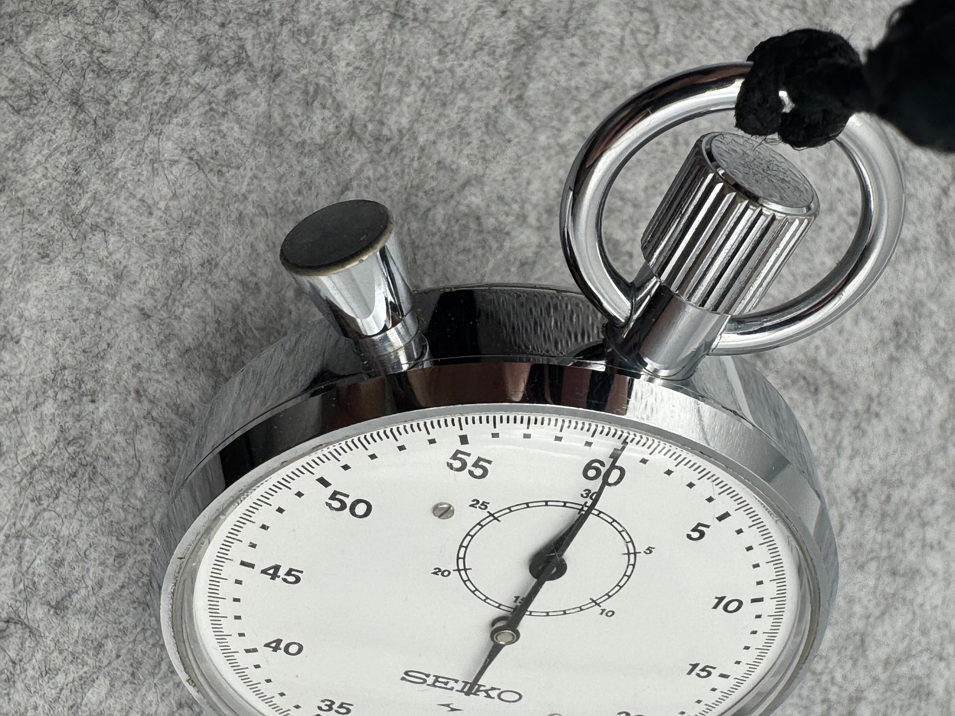 Klassische mechanische Stoppuhr von Seiko, gefertigt in Japan, Modell 88-5061 (ACRP). Diese Stoppuhr stammt aus der professionellen Zeitmesslinie, die Seiko in den 1970er–1980er Jahren u. a. für Sport- und Laboranwendungen entwickelte.