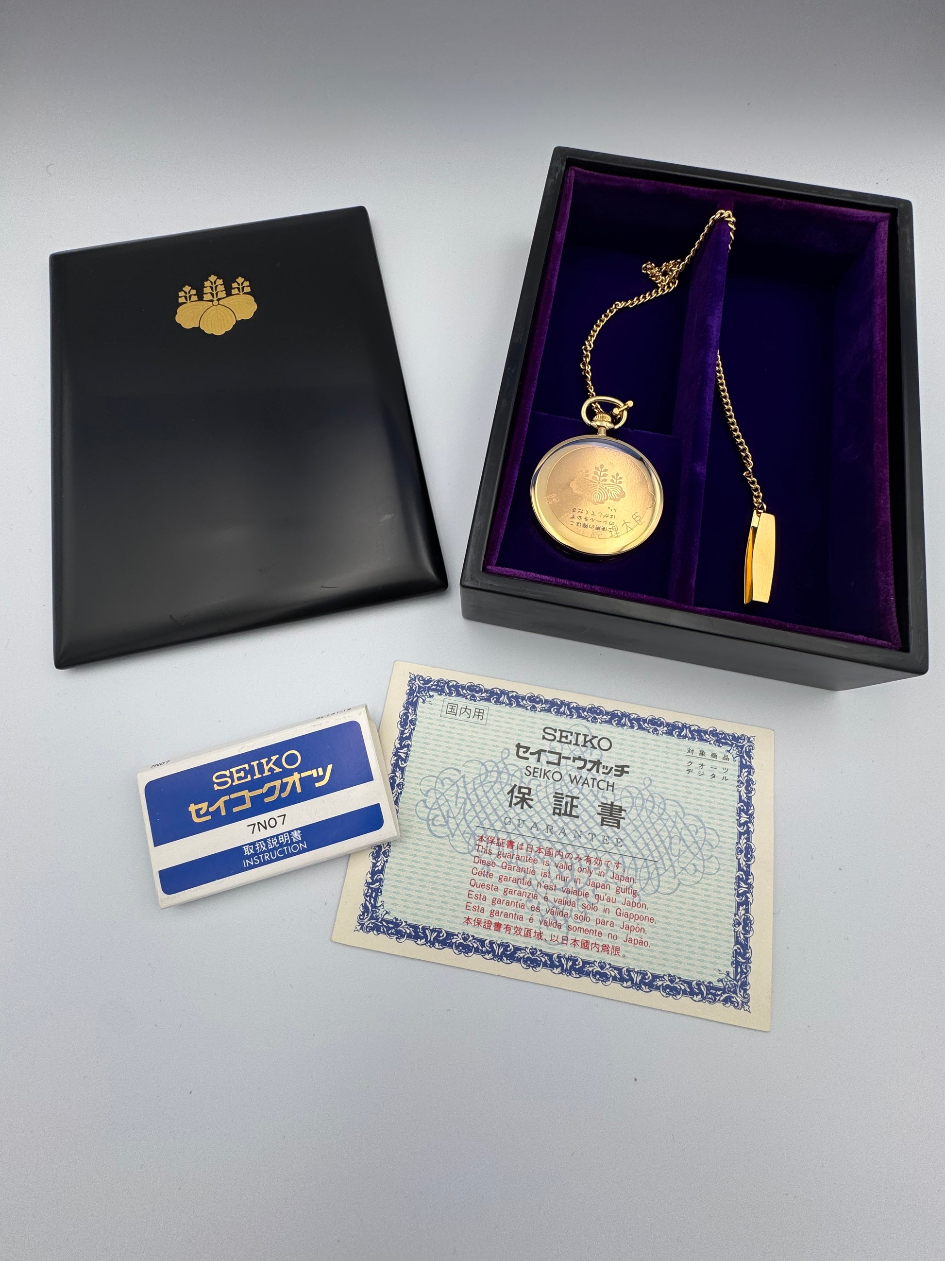 Diese außergewöhnliche Seiko Quarz Taschenuhr mit dem Kaliber 7N07 wurde in Japan gefertigt und ist Teil einer seltenen Sonderausgabe, die von Seiko als offizielles Geschenk des japanischen Premierministers („Prime Minister’s Award“) überreicht wurde. Sie ist ein Symbol für japanische Handwerkskunst, Präzision und formale Eleganz.