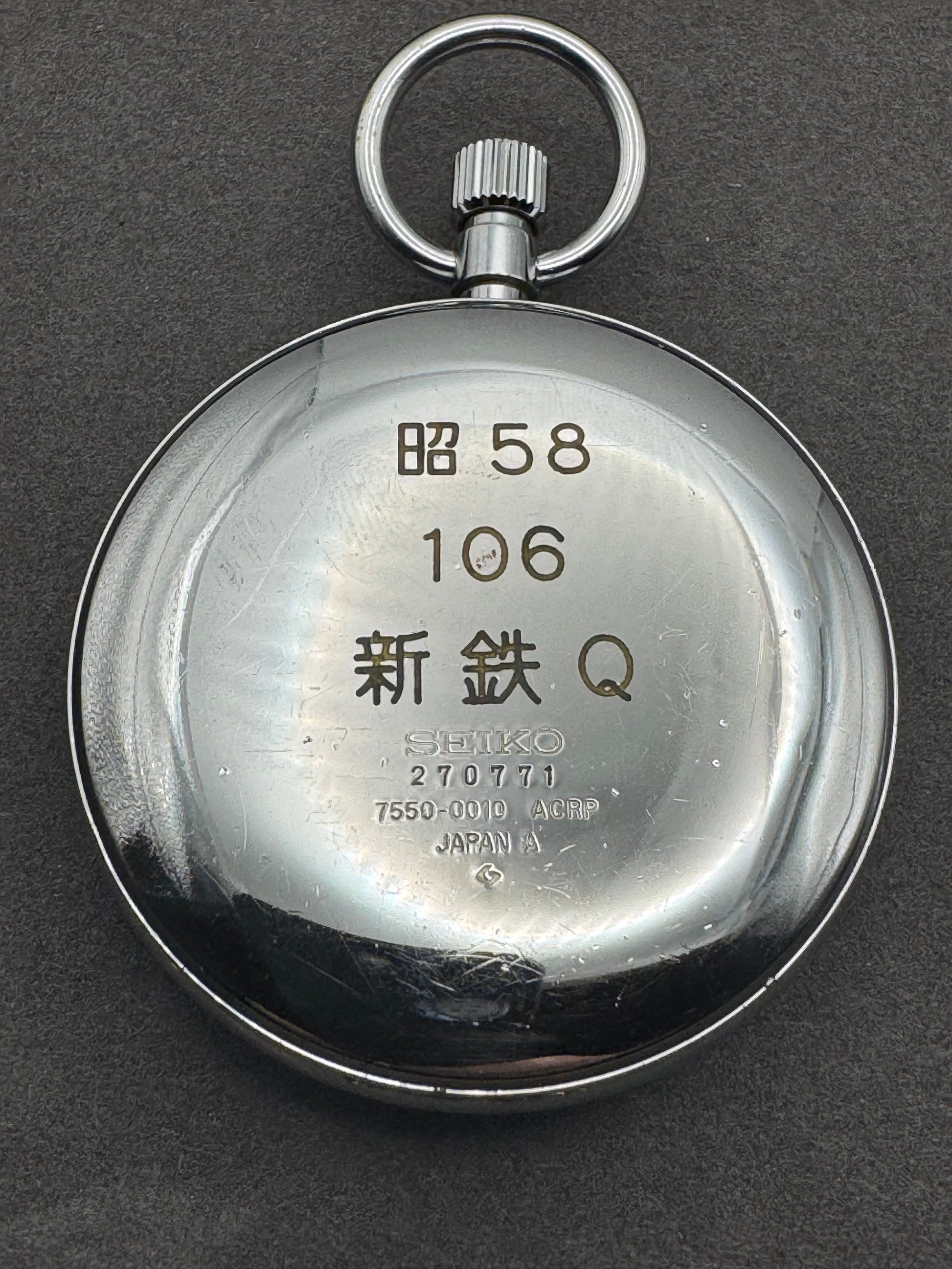 Die Gravur 新鉄Q steht für „Shin-Tetsu Division Q“ – eine regionale Zuteilung innerhalb der Japanischen Staatsbahn. Sie weist dieses Modell als offizielle Dienstuhr aus, die ausschließlich an Eisenbahnpersonal ausgegeben wurde.