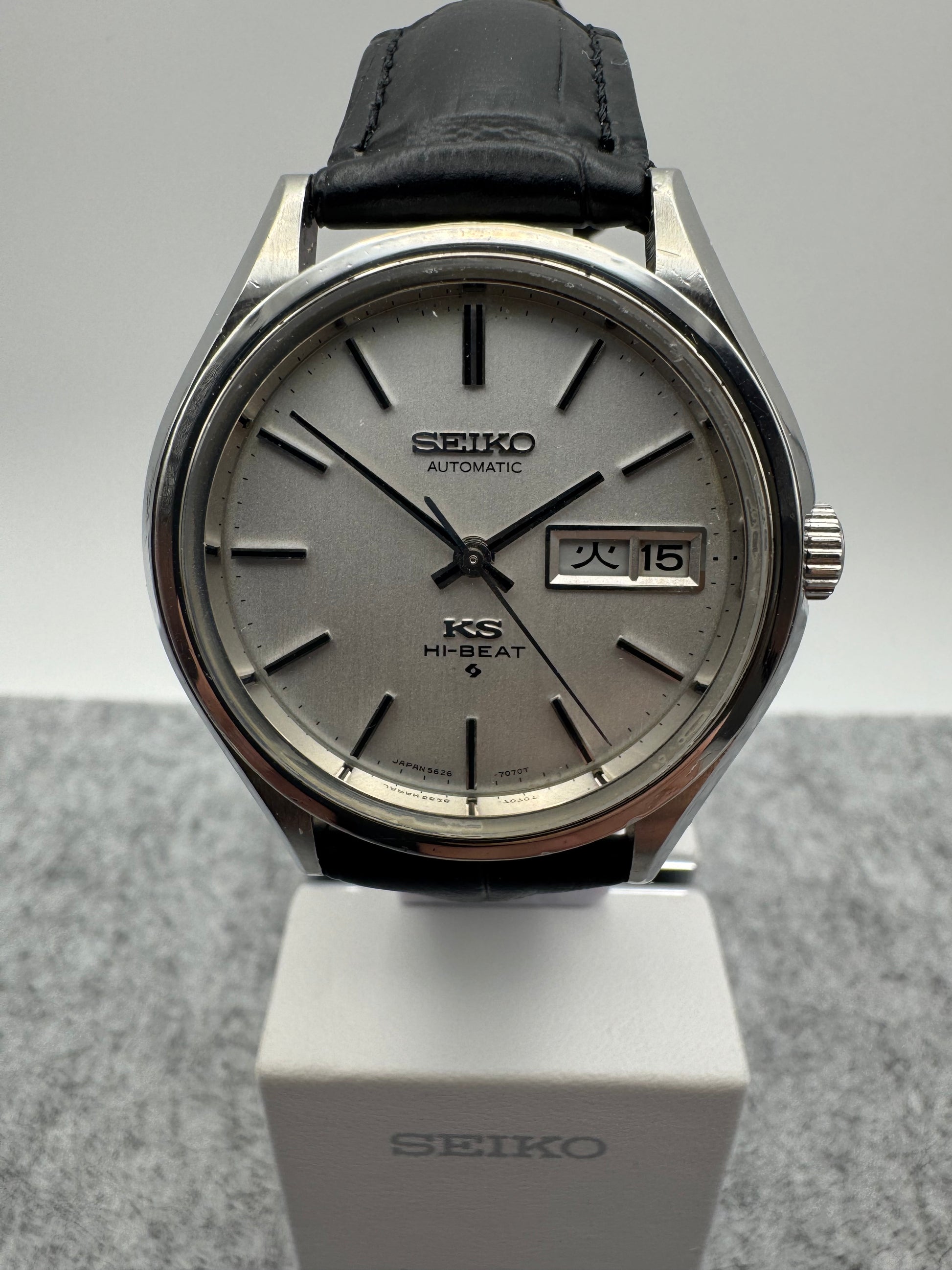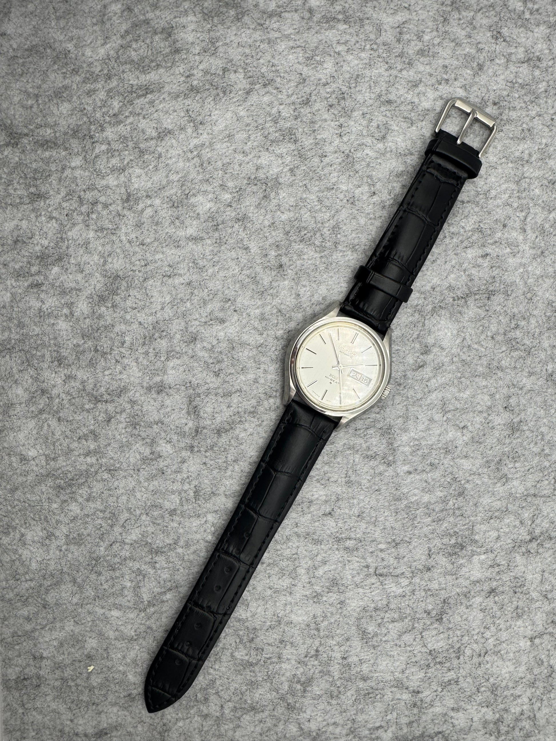 Diese Uhr aus November 1971 zeigt die für King Seiko typische sachliche Eleganz: ein silbernes Sonnenschliff-Zifferblatt, scharf facettierte Indizes, Dauphine-Zeiger und die charakteristische doppelte Gehäusekante. Das KS-Logo auf der Krone verweist auf die Zugehörigkeit zur obersten Qualitätsstufe unterhalb der Grand Seiko-Linie.