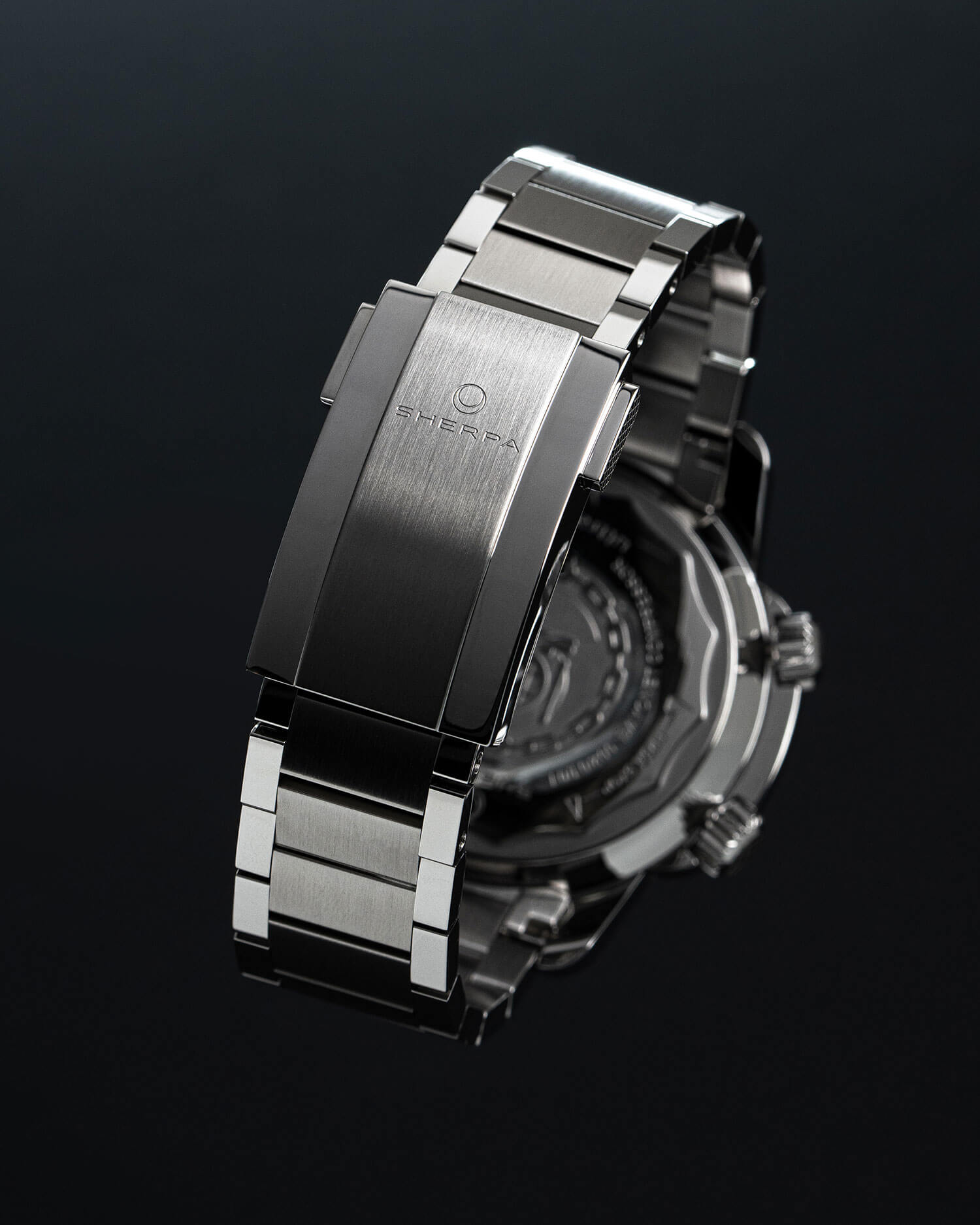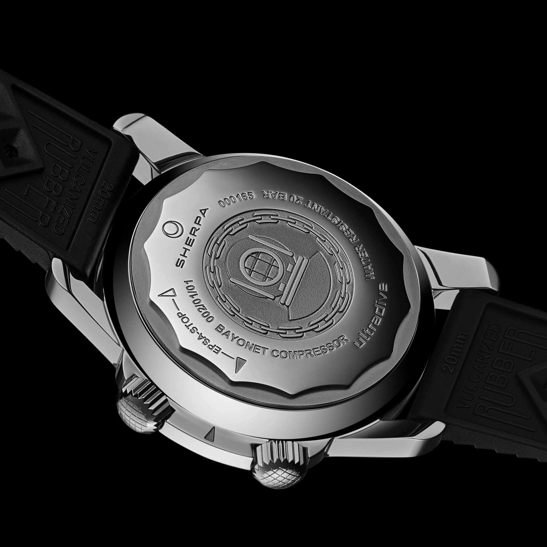 Begleitet wird das Zifferblatt von der schwarzen inneren Tauchlünette mit weißem Aufdruck – zusammen mit dem roten Datum die perfekte Tuxedo-Konfiguration. Mit dem einzigartigen Sherpa Bajonett-Kompressor-Gehäuseboden und den Kompressor-Kronen ist die Ultradive „Tuxedo“ 20 bar (200 m) wasserdicht.