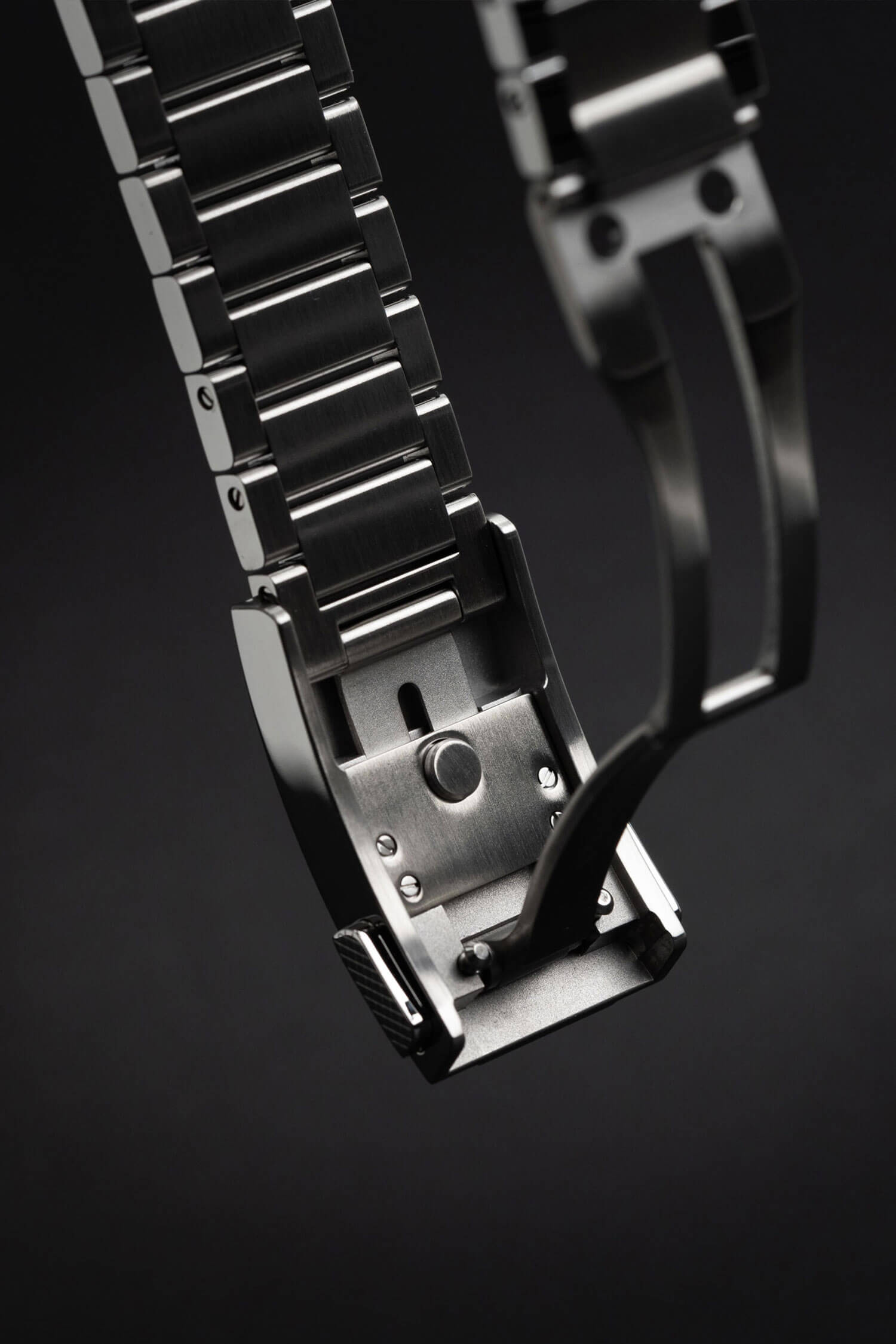 Die Ultradive „Tuxedo“ mit versilbertem Zifferblatt und schwarzer Lünette erweitert die Ultradive-Reihe um eine neue Variante. Wie bei der Ultradive Moon ist das gewölbte Zifferblatt mit einem zarten Sonnenschliff versehen, der galvanisch mit Silber beschichtet wird. Die applizierten Indizes und Zeiger mit diamantgeschliffenen Fasen verleihen der Uhr eine funkelnde Ausstrahlung, die durch den eleganten Glanz und das Lichtspiel des silbernen Zifferblatts noch verstärkt wird.
