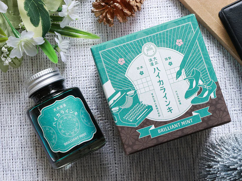Brilliant Mint ist ein frischer, lebendiger Mintton, der an dekorative Akzente und farbige Drucke aus der Taisho- und frühen Showa-Zeit erinnert. Die Tinte wirkt leicht, klar und modern, mit einem Hauch Retro-Charme – ideal für Überschriften, Akzente, Markierungen, kreatives Journaling oder jeden, der seinem Schriftbild eine besondere, aber gut lesbare Farbnote geben möchte.